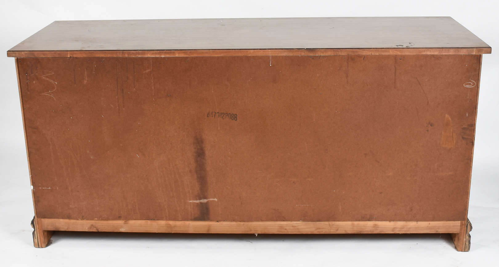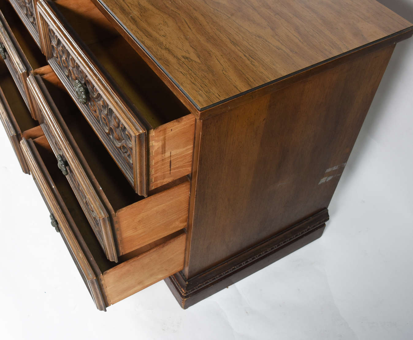 Cômoda de madeira nobre com 5 gavetas tendo puxadores de metal, encimada por espelho de cristal bisotado com moldura ...