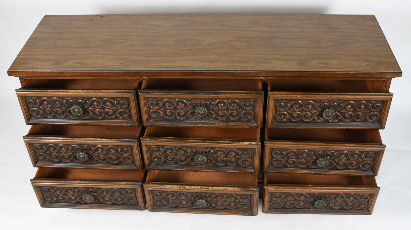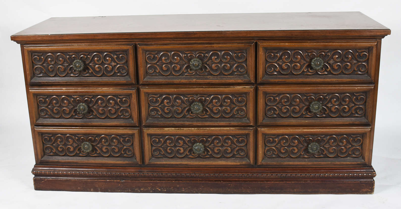 Console de madeira nobre com saia vazada e pernas ligeiramente arqueadas com entalhes florais, tampo de mármore, acom...