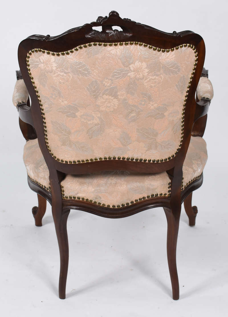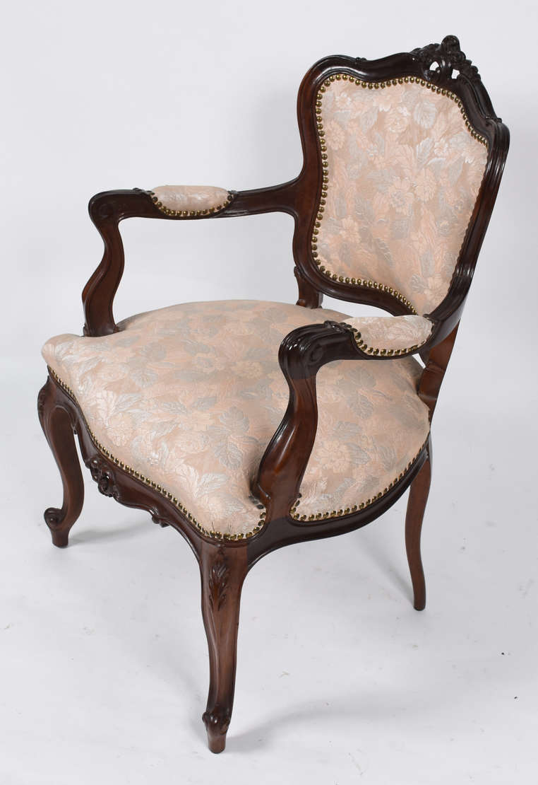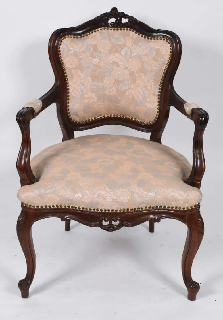 Cadeira de madeira nobre com puff estofada e forrada com tecido floral.