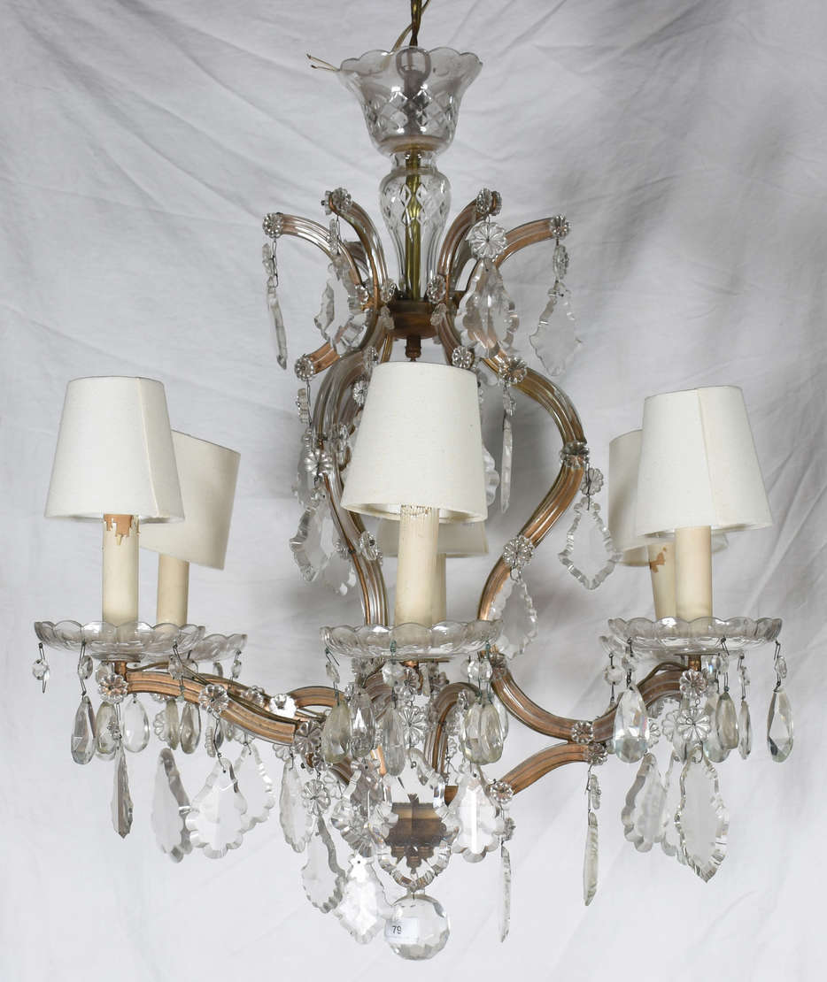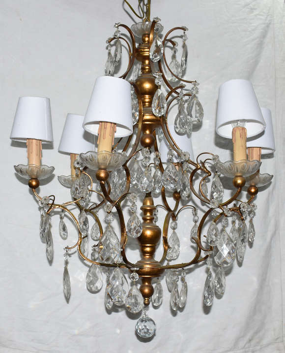 Lustre para 6 luzes, estilo Versailles, estrutura de metal dourado com pingentes e placas de cristal lapidado.