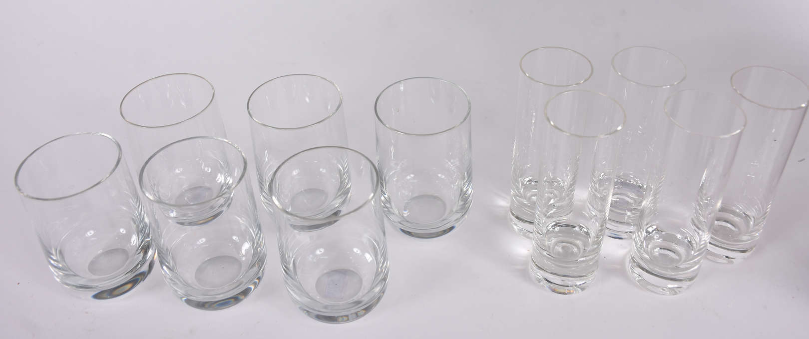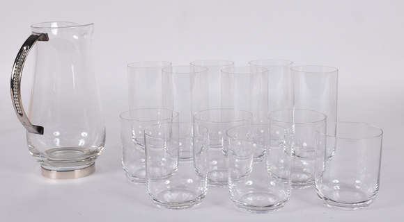 Diversas peças de cristal, sendo: Seis copos longos e seis curtos para whisky e jarra com alça de metal.
