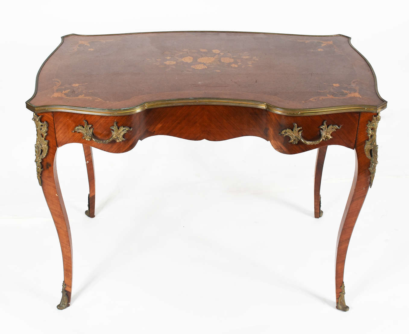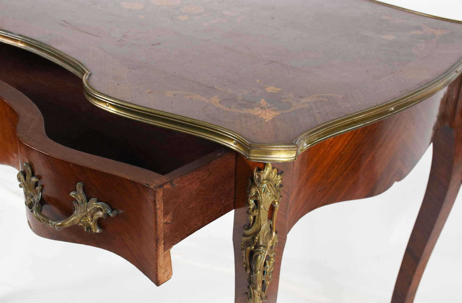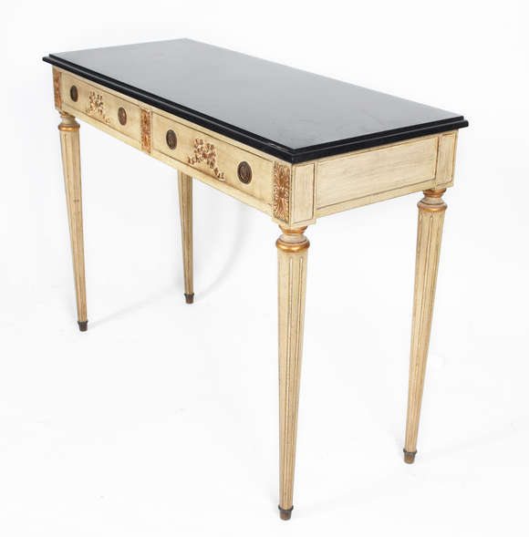 Mesa de encostar de madeira nobre em decapé, duas gavetas, pernas cilíndricas e tampo de mármore preto.