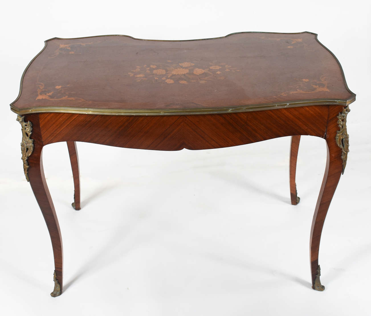 Aparador em madeira nobre tampo recortado. Pernas recurvas se unindo por travessões e pino central