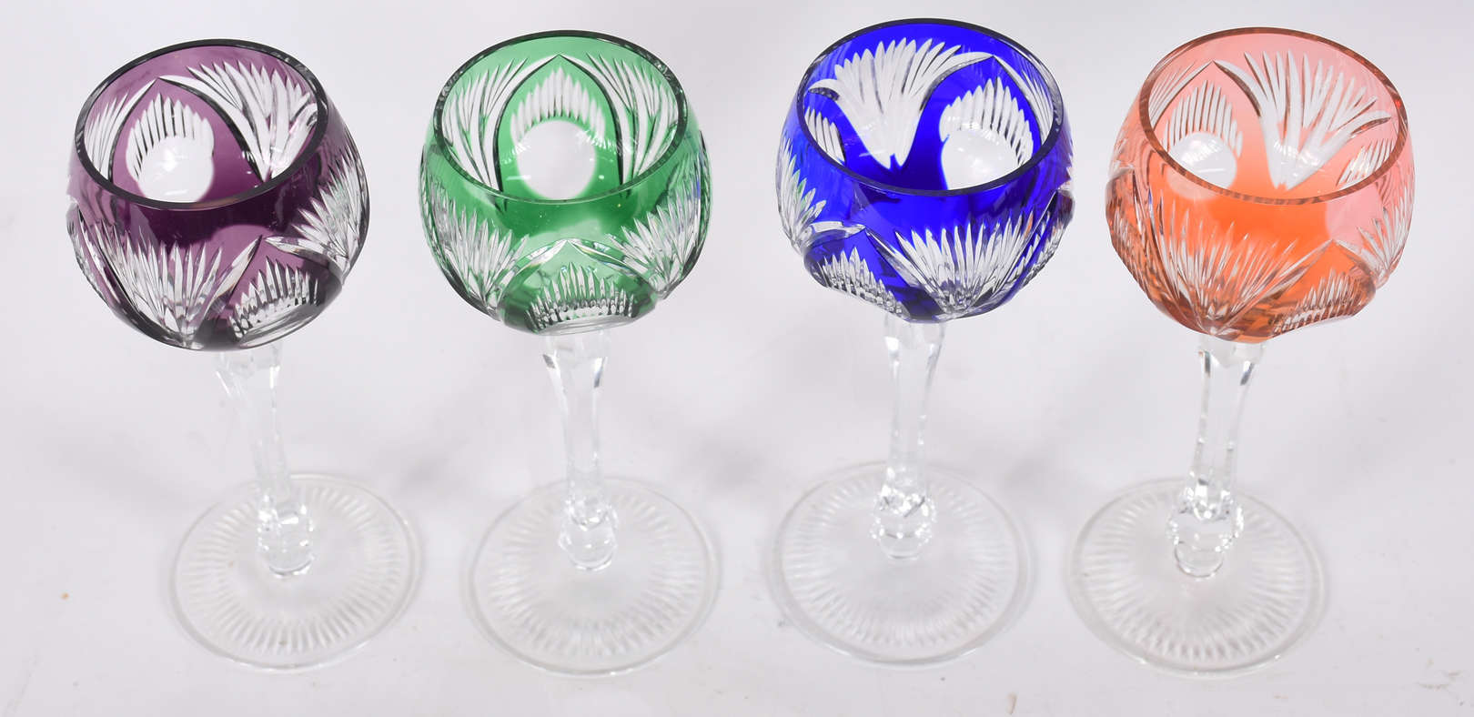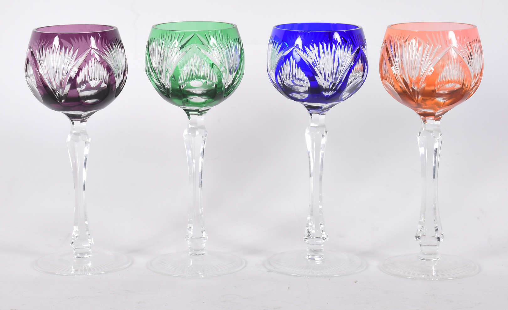 Quatro taças para vinho em cristal BACCARAT frances doublé lapidado nas cores azul, verde, vermelho e rosa. (duas com...