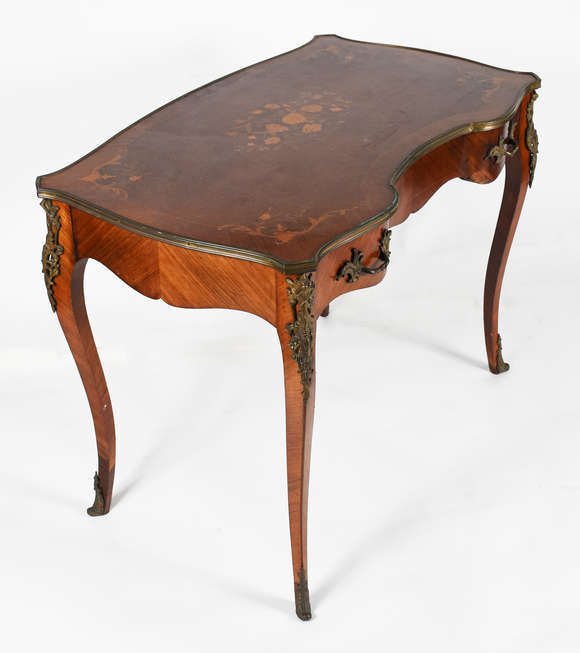 Mesa francesa de madeira nobre trabalhada em marqueterie.