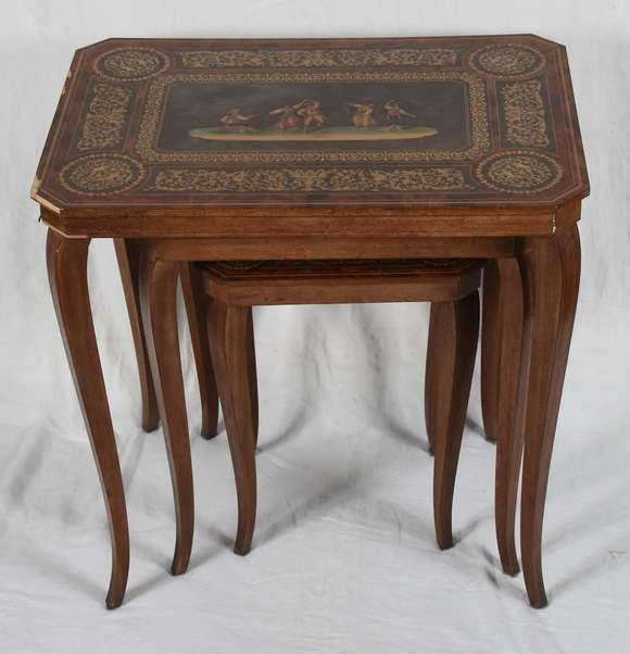 Mesa ninho italiana de madeira trabalhada, com 3 peças, pernas de encaixe.