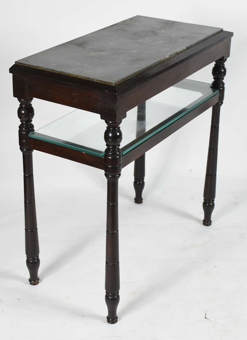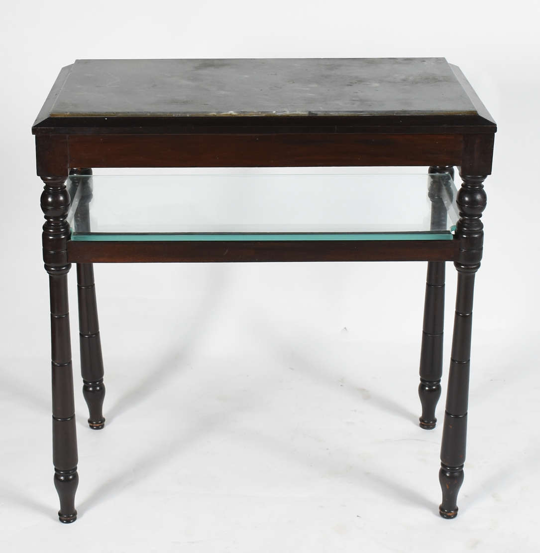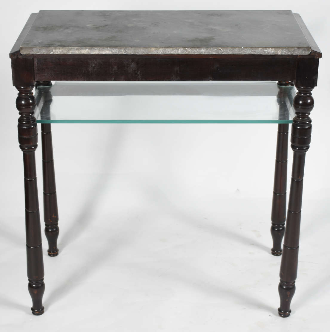Mesa auxiliar com base de metal, tampo de vidro. (Com bicados).