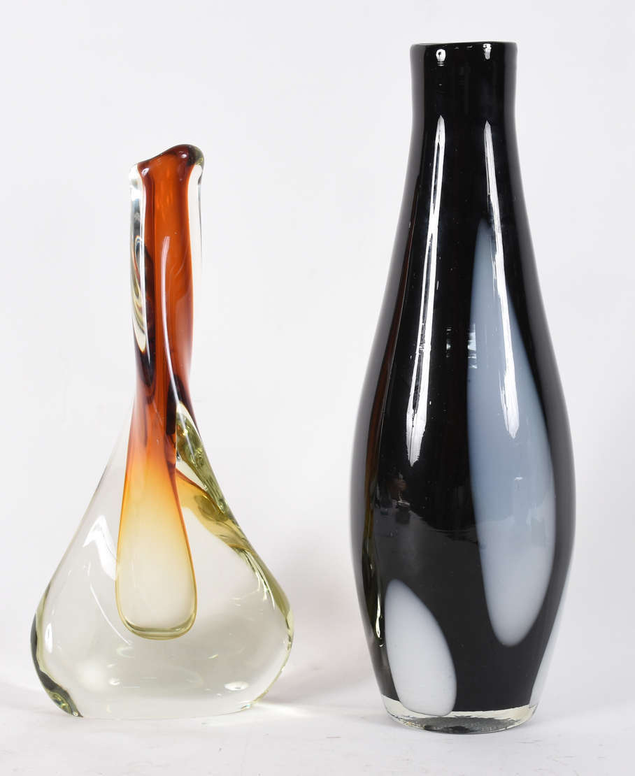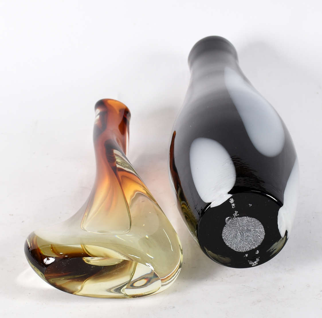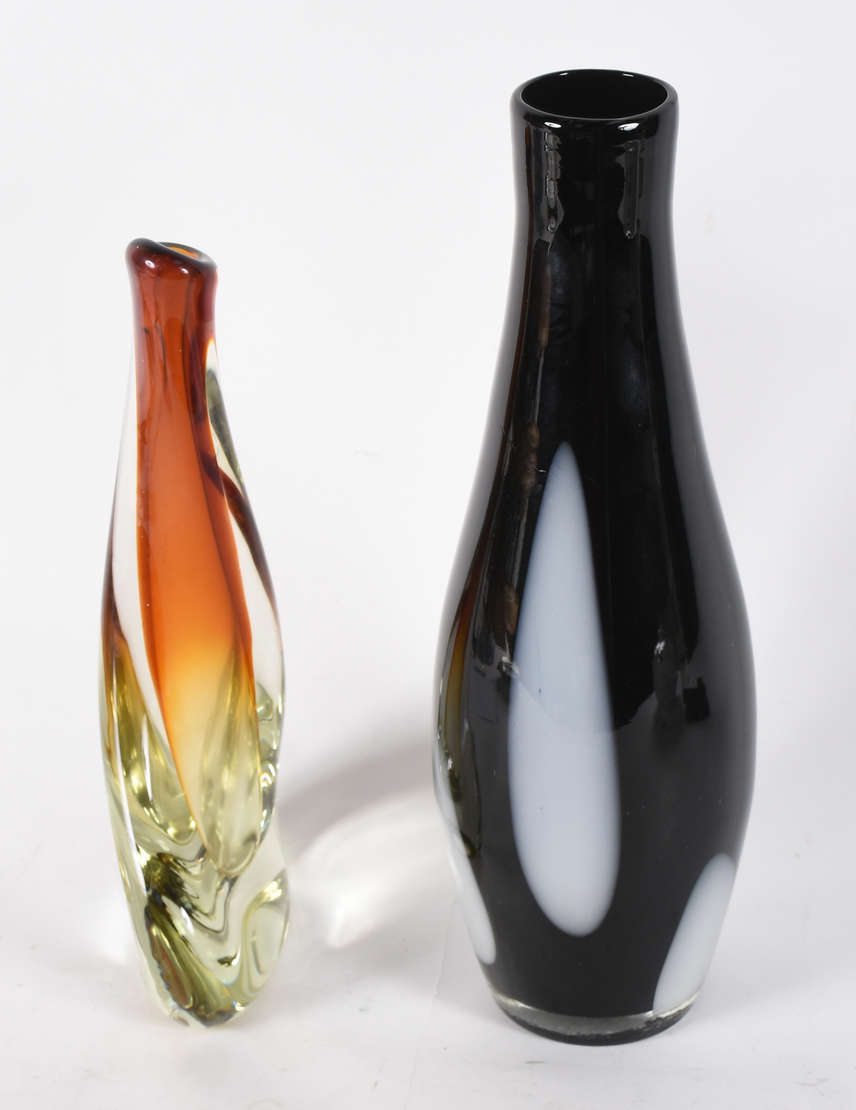Dois vasos decorativos de vidro, sendo um amarelo com serpentina azul por fora(altura 19 cm), e outro multicor com bo...