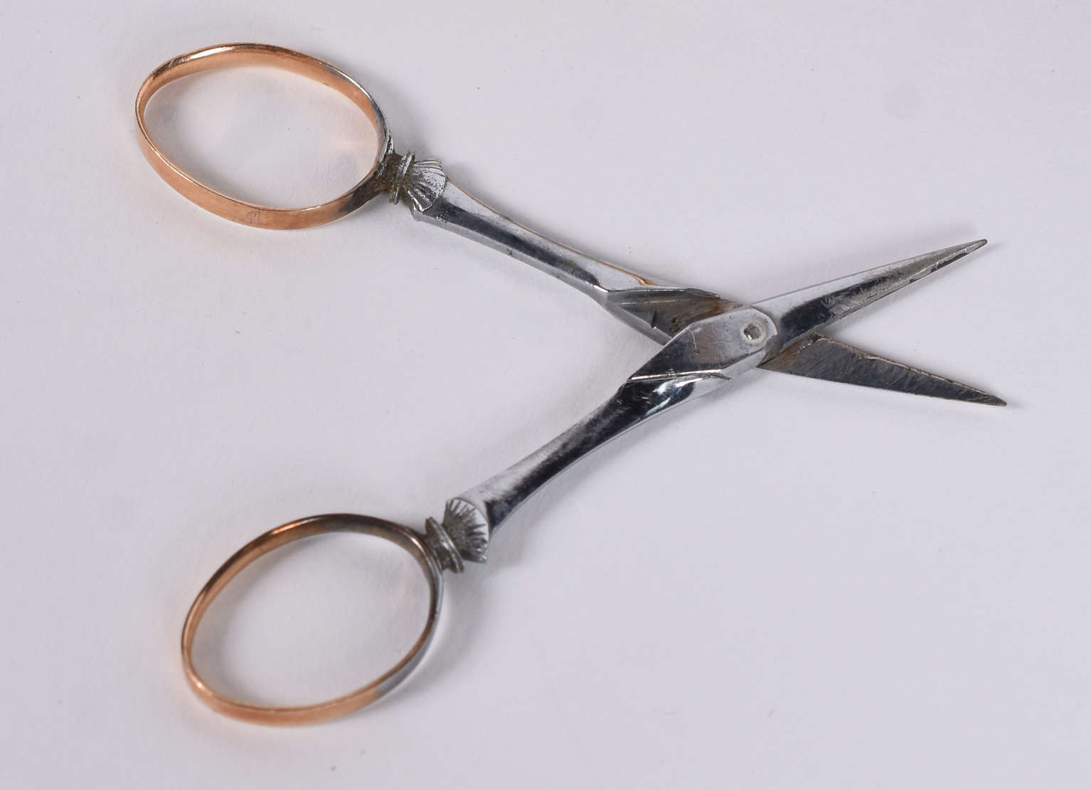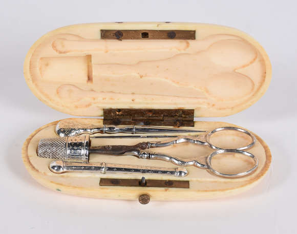 Estojo de marfim para costura com cinco acessórios de metal.
