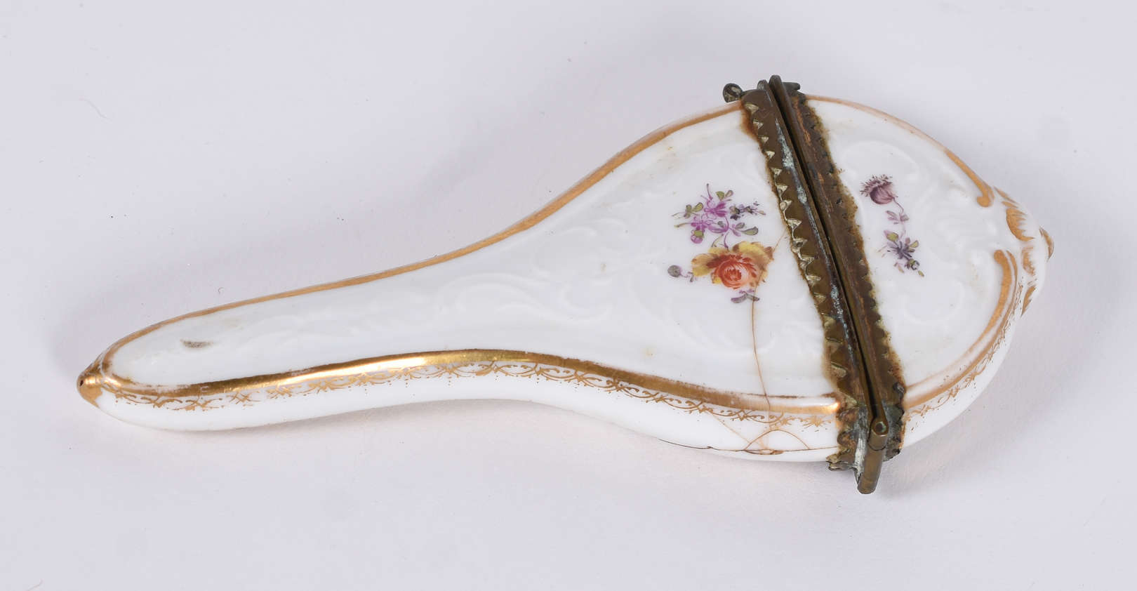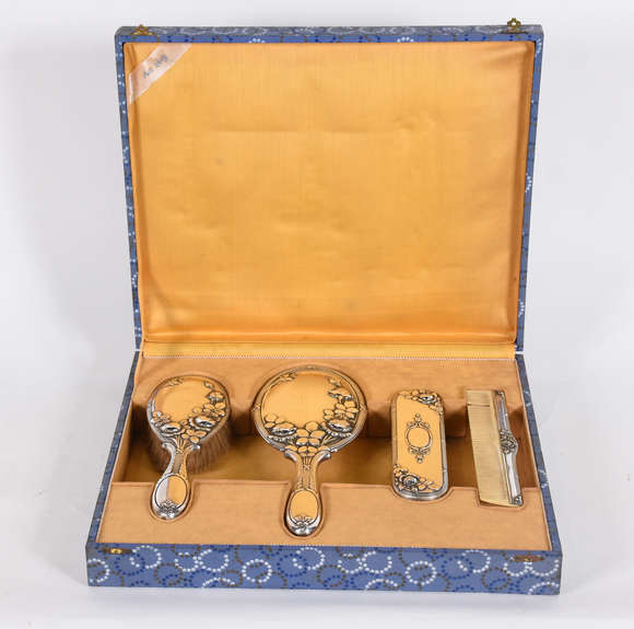 Conjunto para toilette de metal wolff com quatro peças, na caixa.