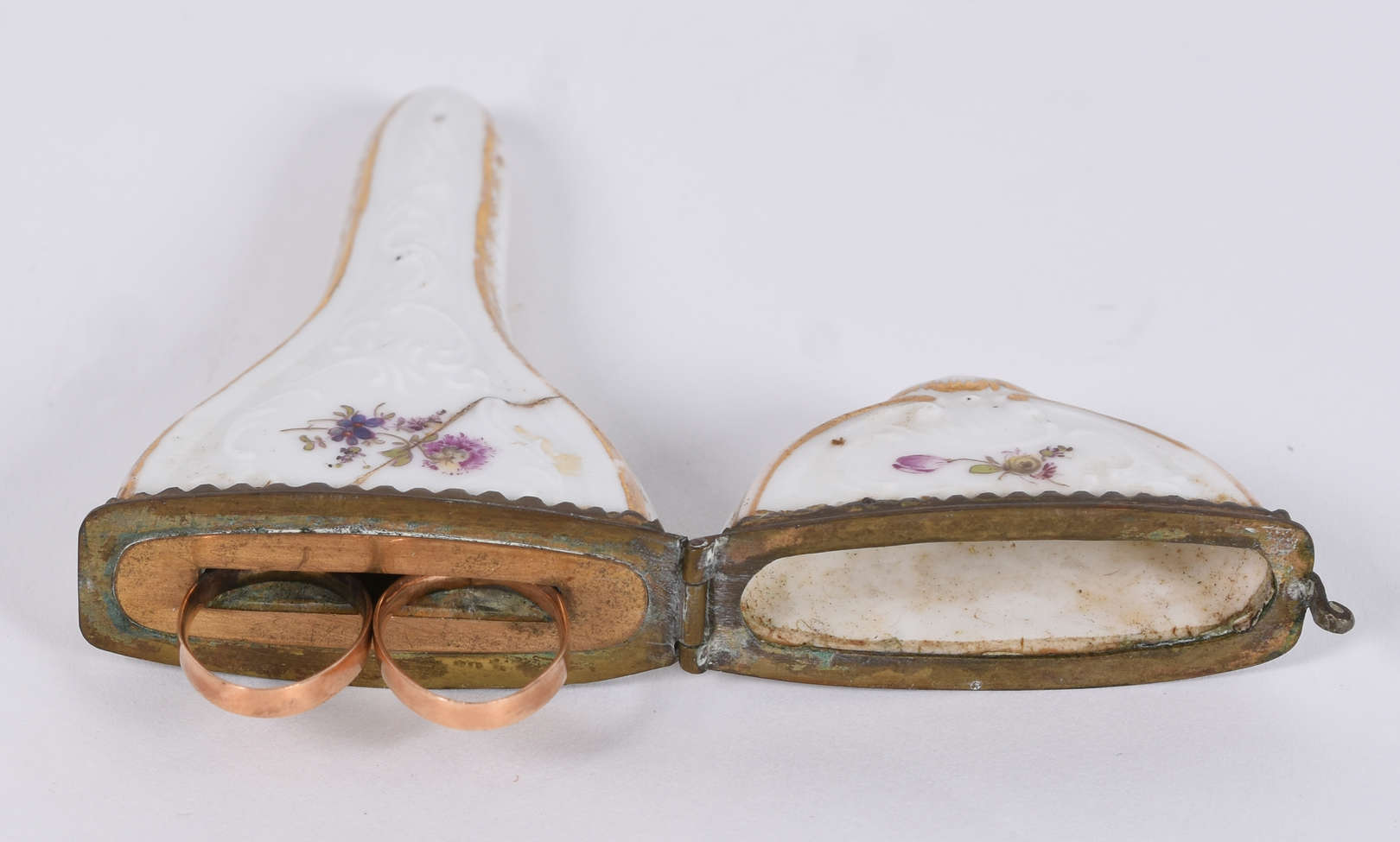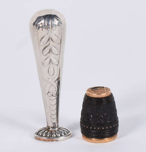 Duas pequenas peças, sendo sinete de prata 800 mls constrastada e dedal de metal. (Por questão de segurança a peça nã...