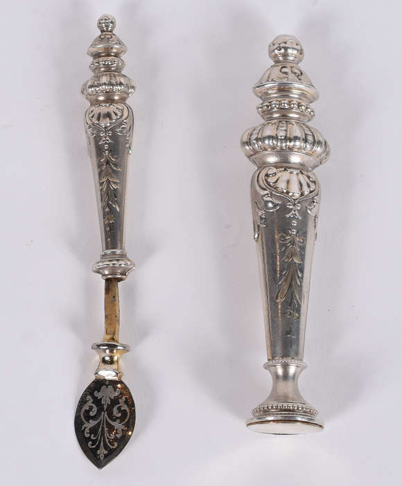 Duas pequenas peças de prata, sendo Sinete para lacre de correspondência e Passa-cera. (Por questão de segurança a pe...