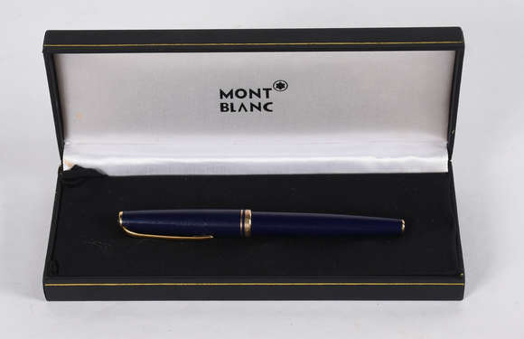 Caneta Mont Blanc na cor azul (arranhada), no estojo.