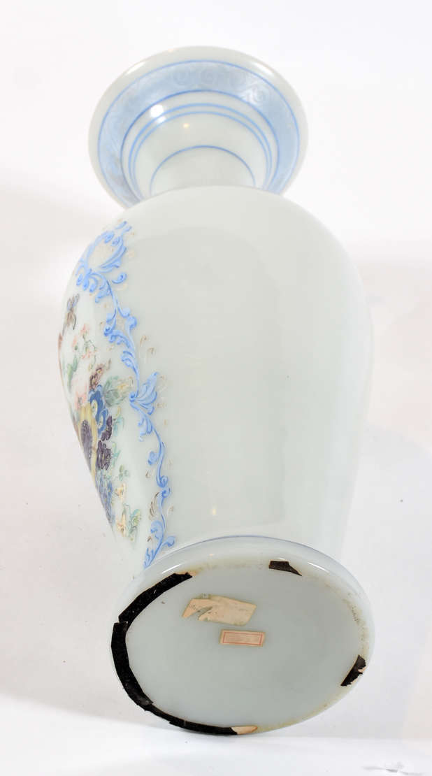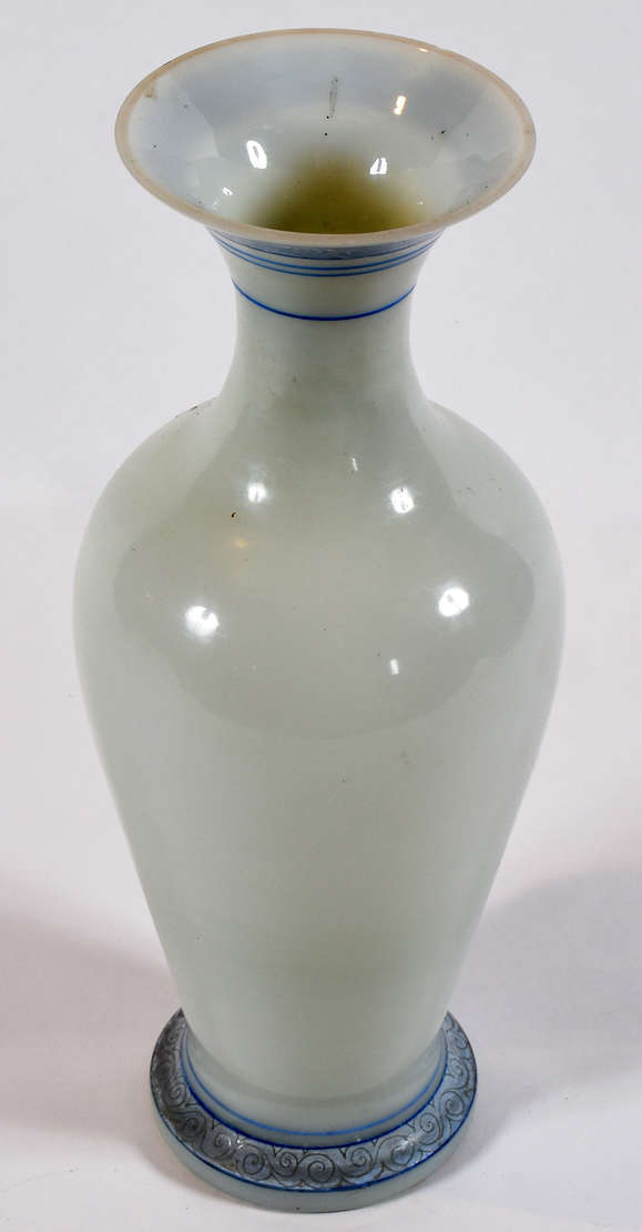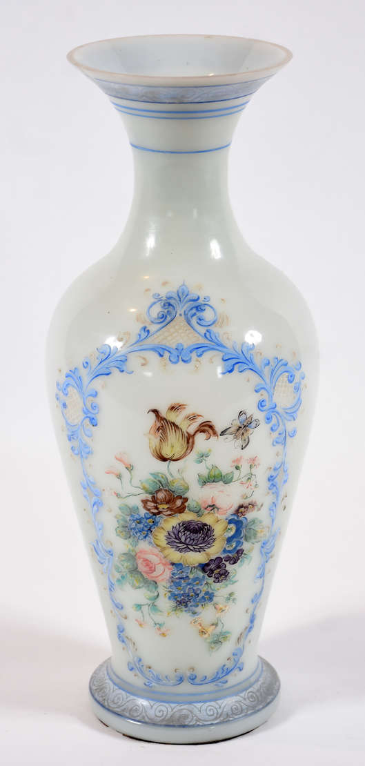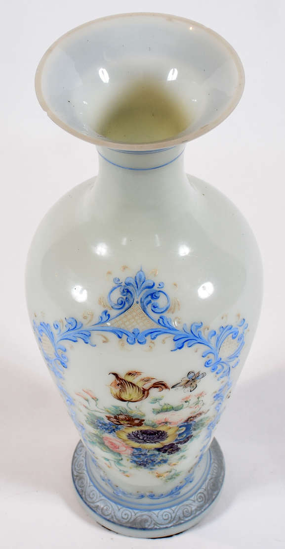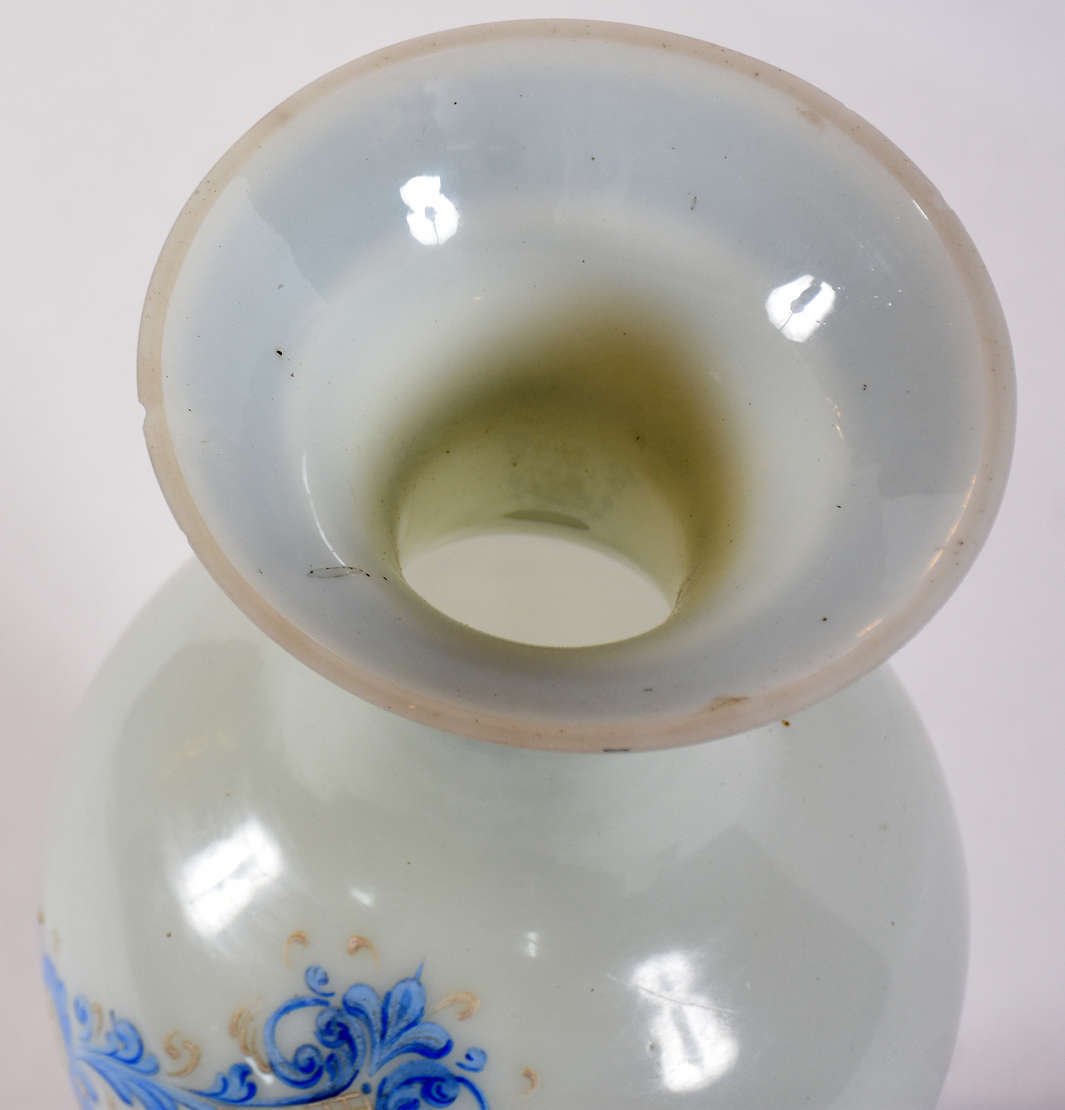 Antigo vaso de porcelana Chinesa decorado com figuras e flores em policromia, bocal com trabalhos em relevo.