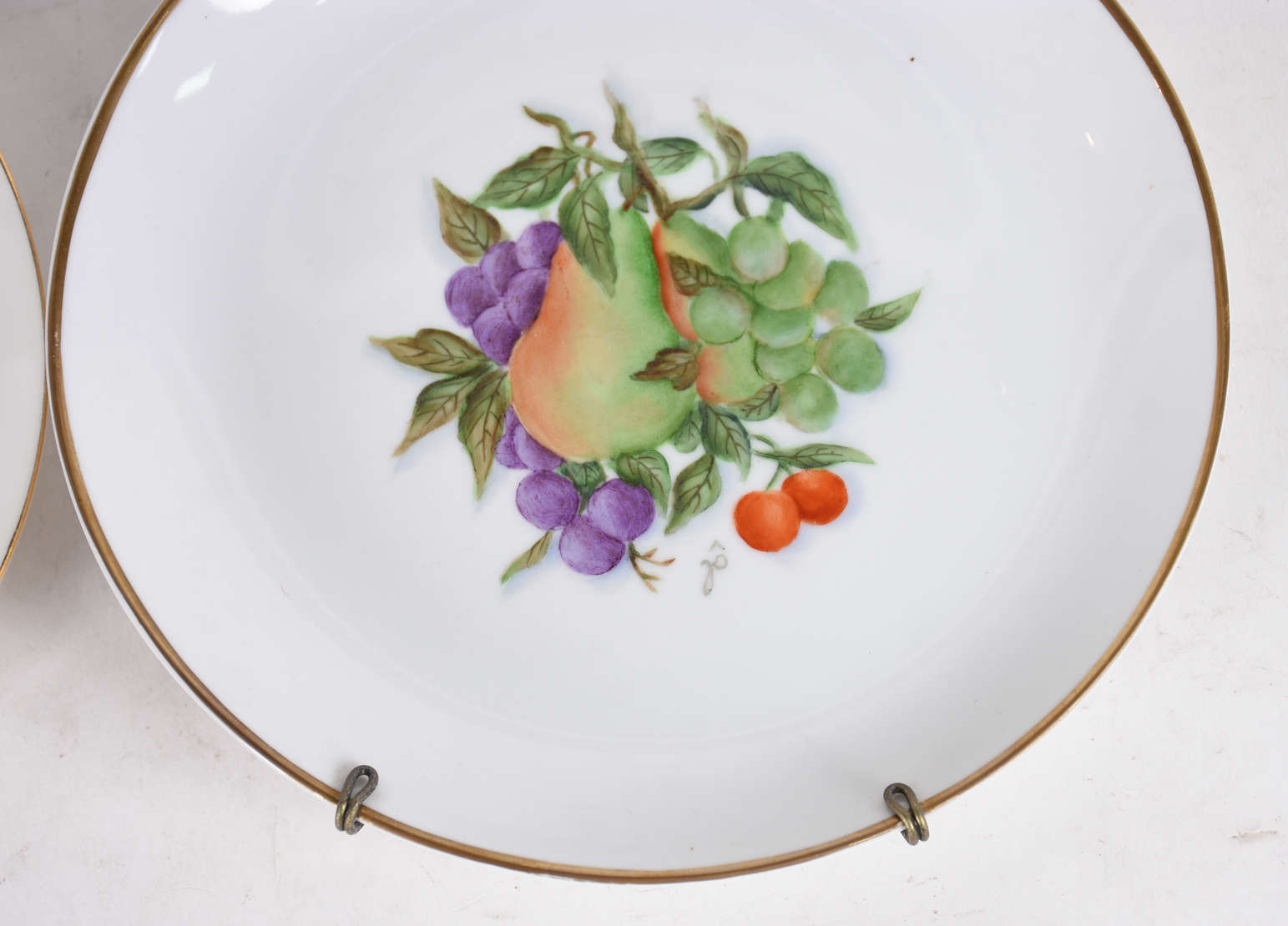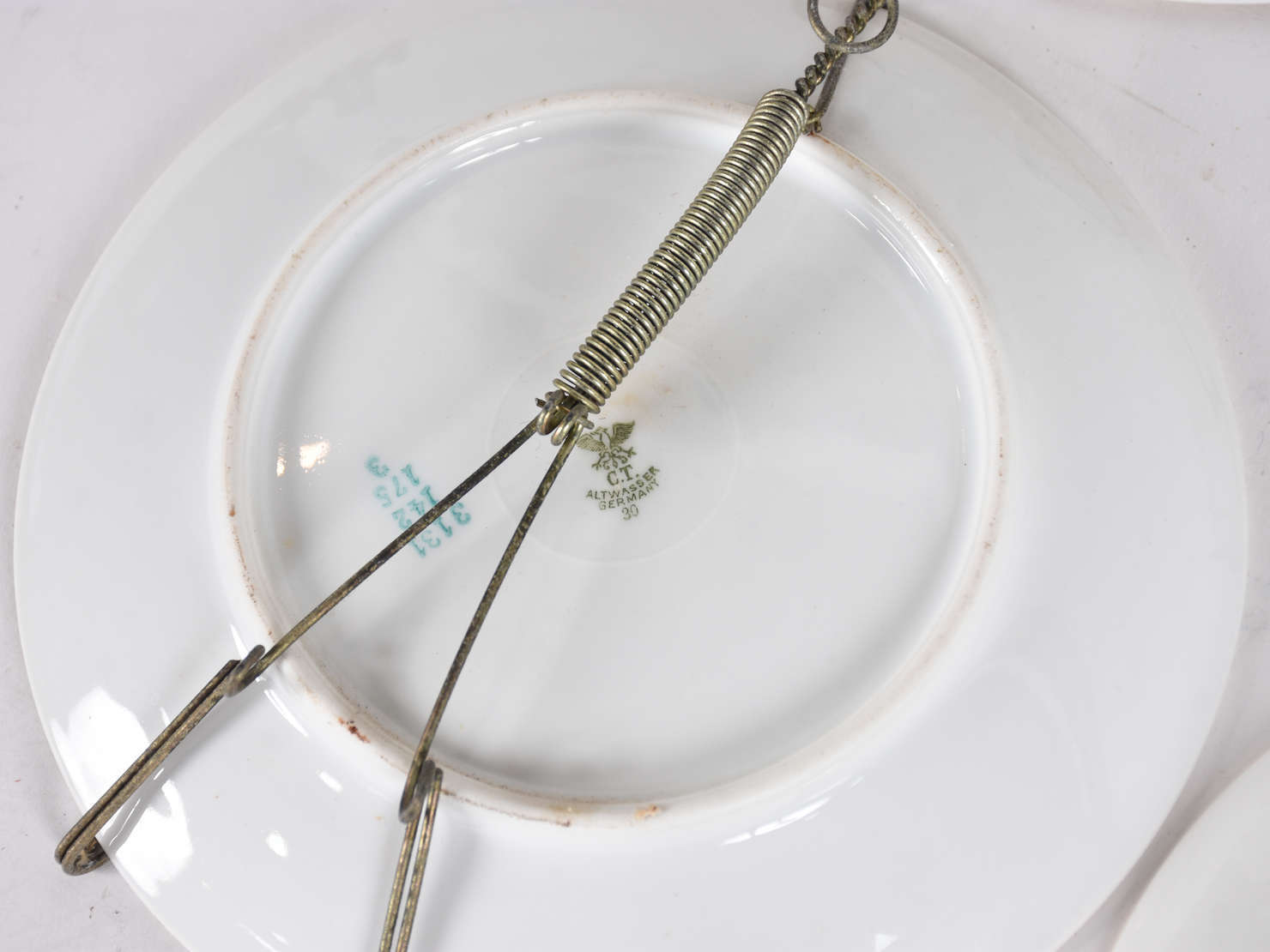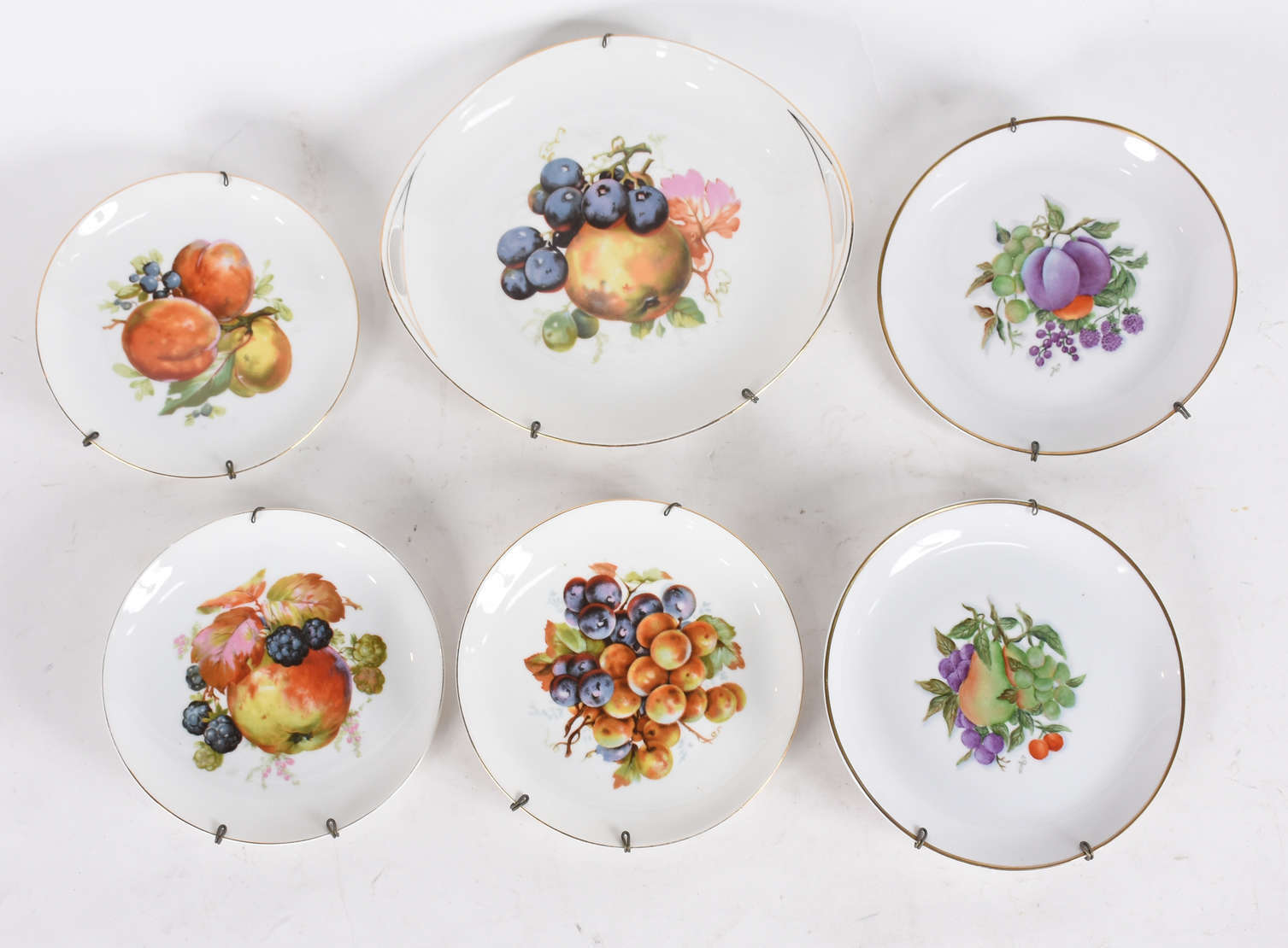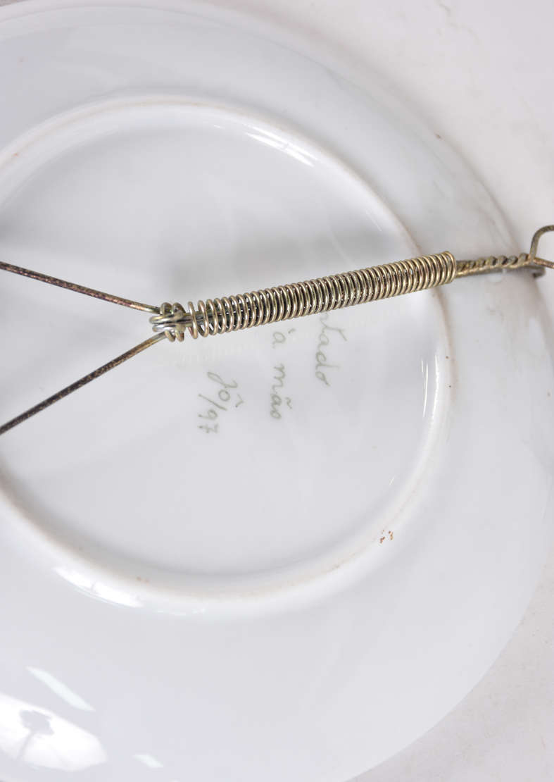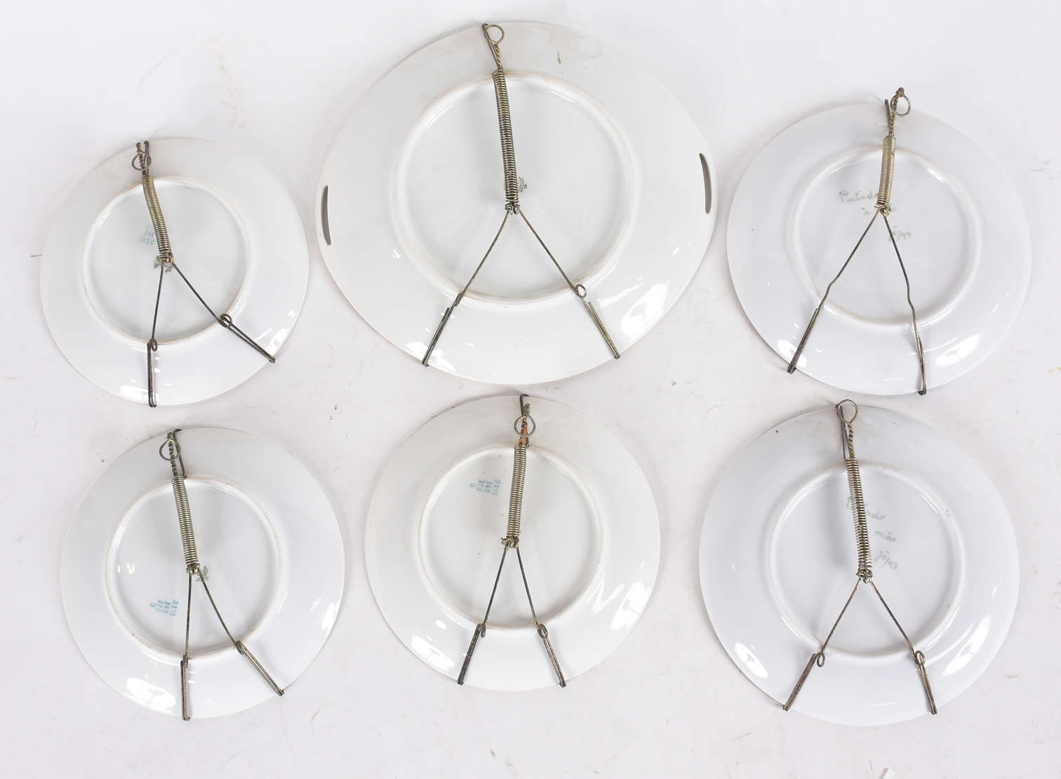 Seis pratos decorativos de parede, sendo 1 grande e 3 pequenos de porcelana alemã e 2 menores pintados à mão, brasileiros, assinados e datados.