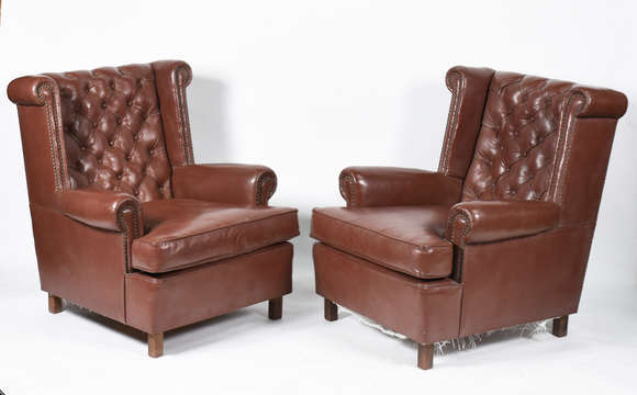 Par de poltronas bergeres estilo ingles, estofadas e forradas de couro sintético marrom, encostos em capitoné.