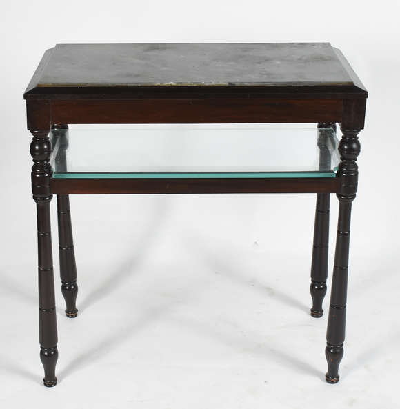 Mesa aparador de madeira nobre com tampo de mármore e prateleira inferior de vidro.