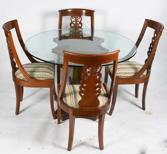 Mesa com 4 cadeiras em madeira entalhada. Tampo com blindex, ficando ao centro espaço expositor. Base chanfrada, cade...