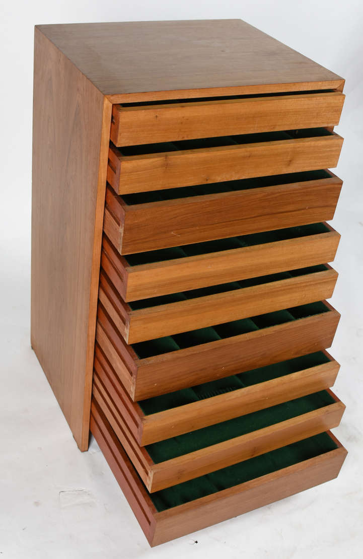 Mesa de centro de madeira nobre, com 2 gavetas que se abrem para ambos os lados e pranchas laterais deslizantes.