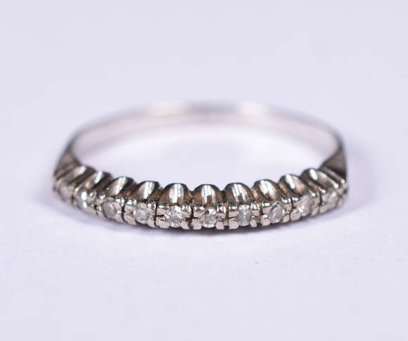 Meia aliança de ouro branco 18 k, com 12 brilhantes. Aro 17. (Por questão de segurança a peça não se encontra na loja).