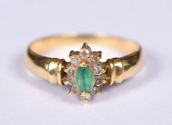 Anel de ouro amarelo 18 k, 10 brilhantes e pedra verde. Aro 17. (Por questão de segurança a peça não se encontra na l...