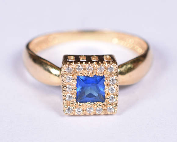 Anel de ouro amarelo 18 k, pedra azul e safiras brancas. Aro 17. (Por questão de segurança a peça não se encontra na ...