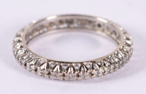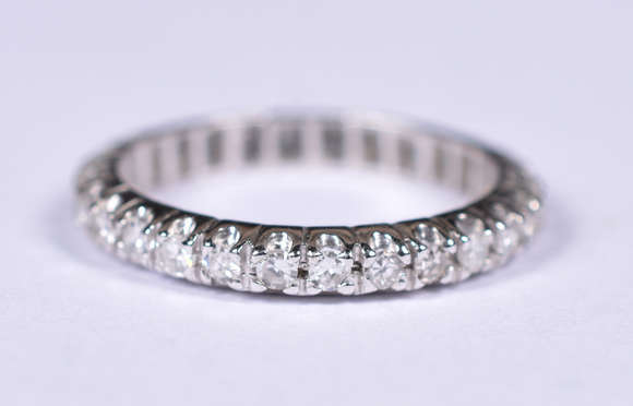 Aliança completa de ouro branco 18 k, com 25 brilhantes de 0,4 ct cada. Total 1 ct. Aro 13. (Por questão de segurança...