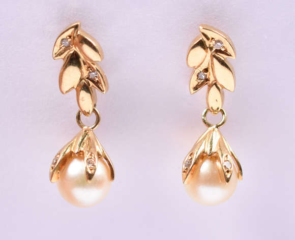 Par de brincos de ouro amarelo, 4 brilhantes e 2 pérolas. (Por questão de segurança a peça não se encontra na loja).