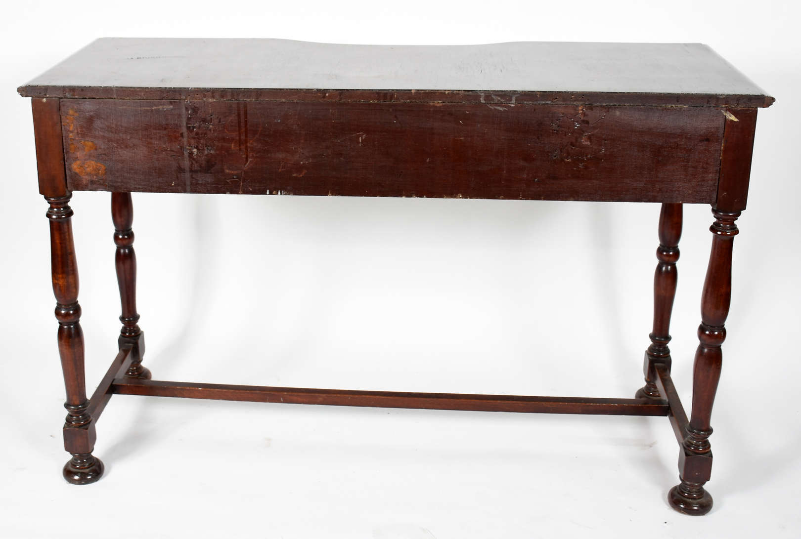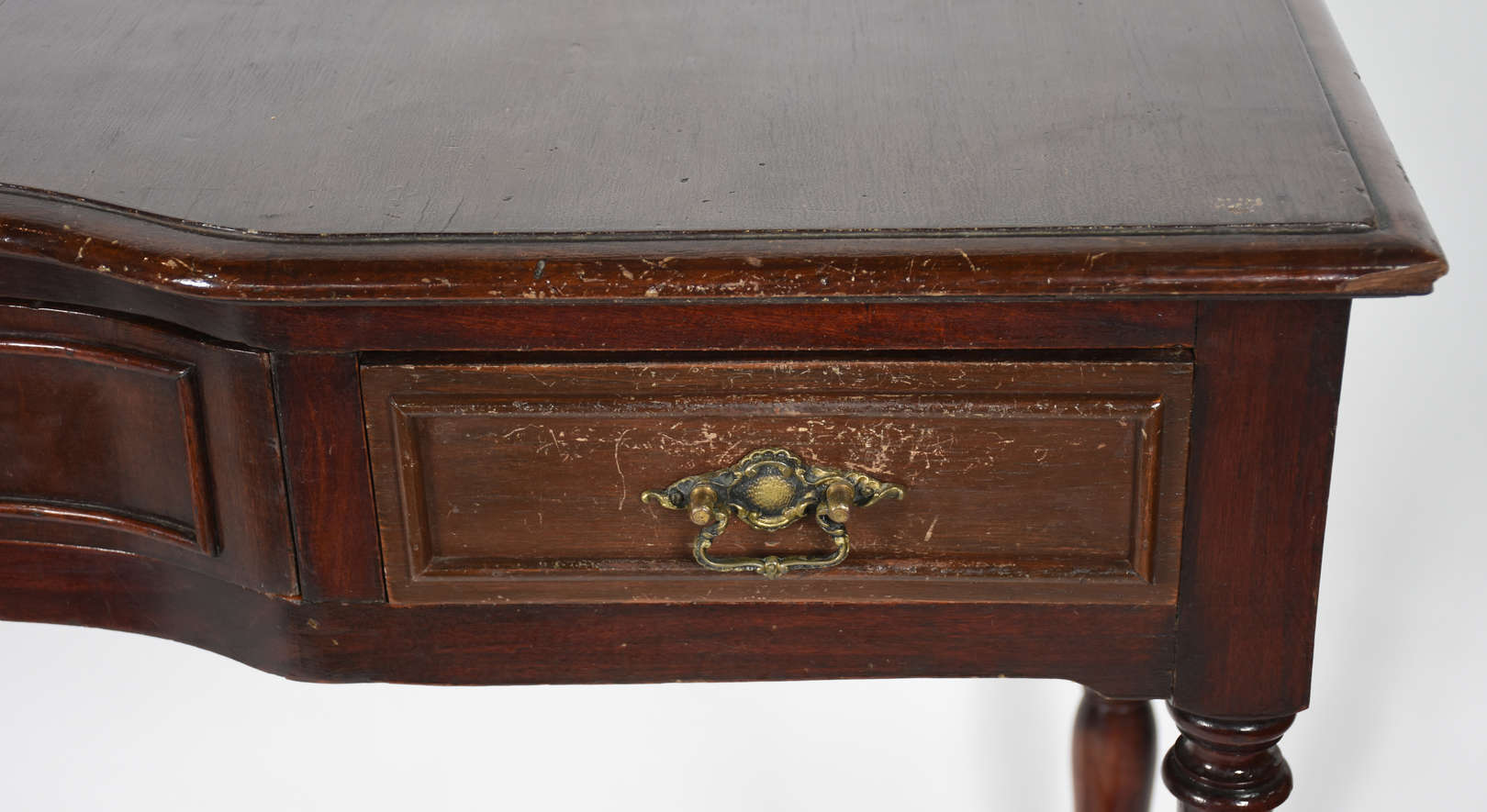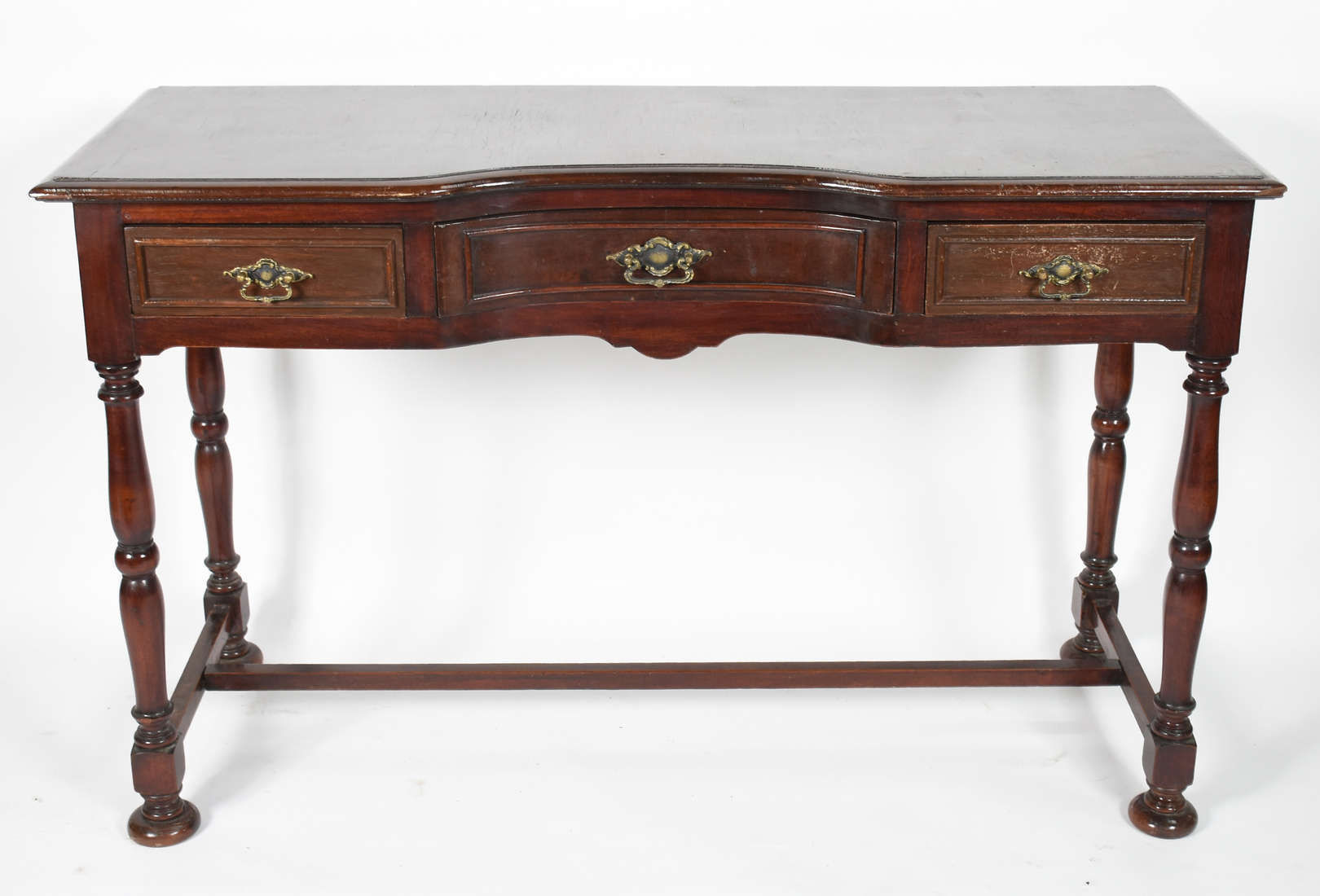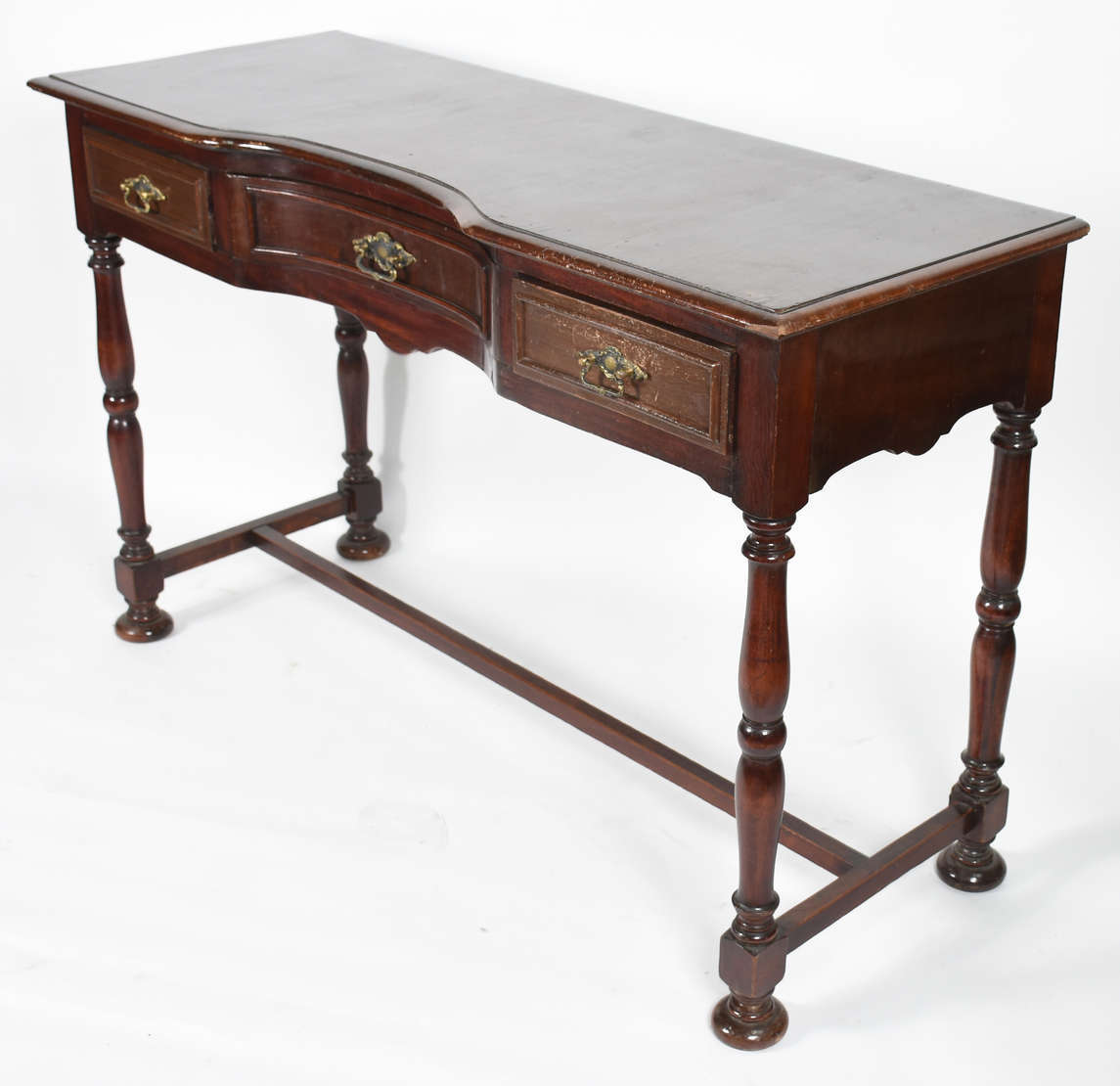 Aparador em madeira nobre tampo recortado. Pernas recurvas se unindo por travessões e pino central