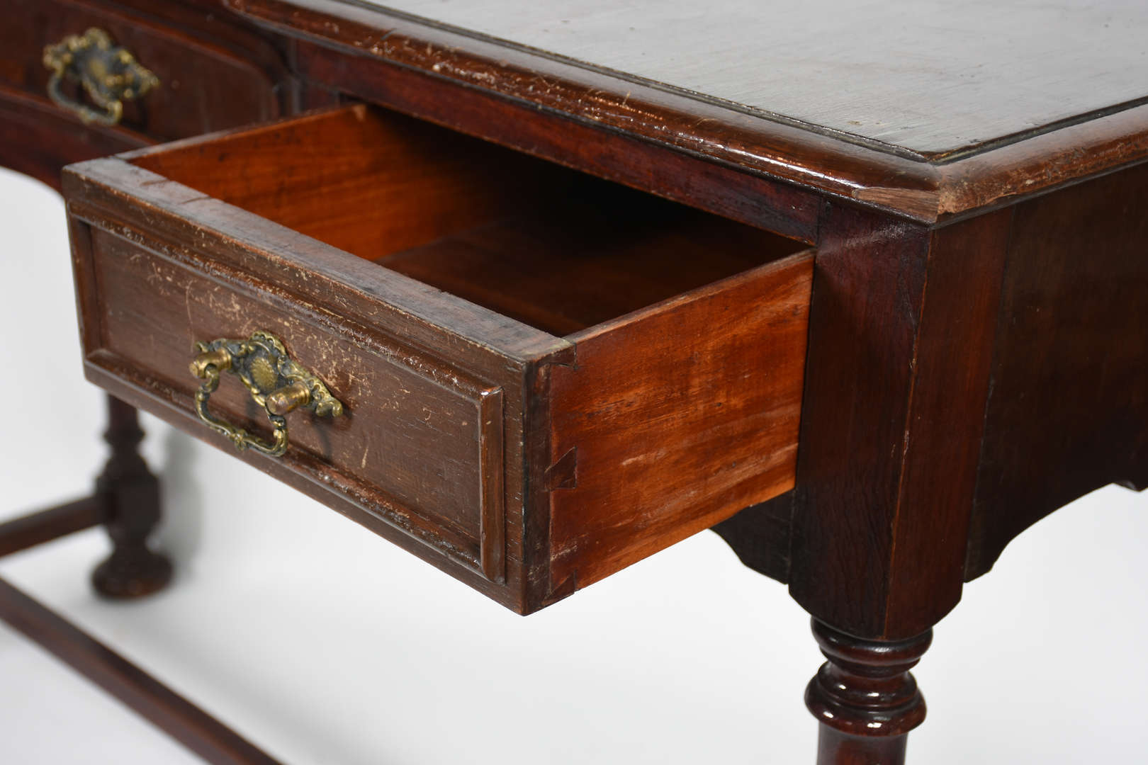 Mesa de madeira nobre, pernas ricamente entalhadas terminando em patas de leão, ligadas por trave inferior.