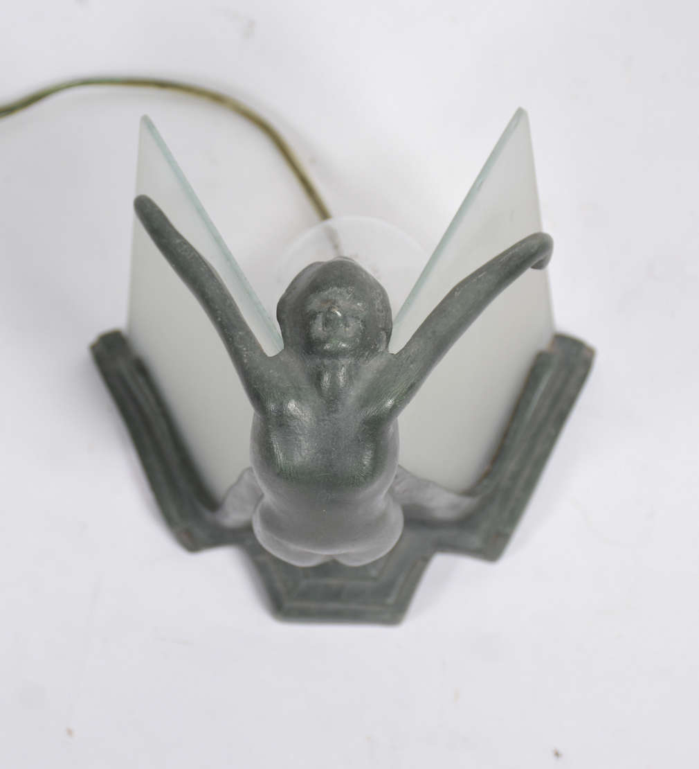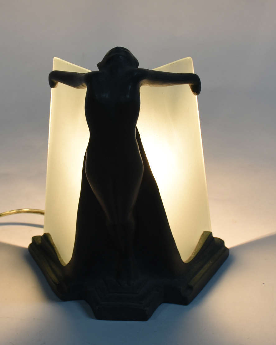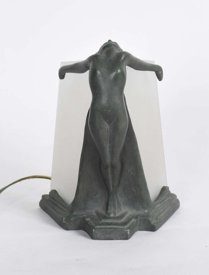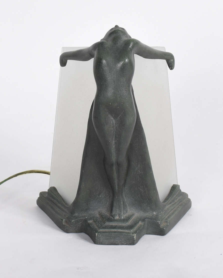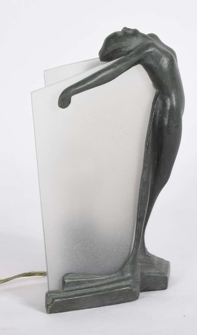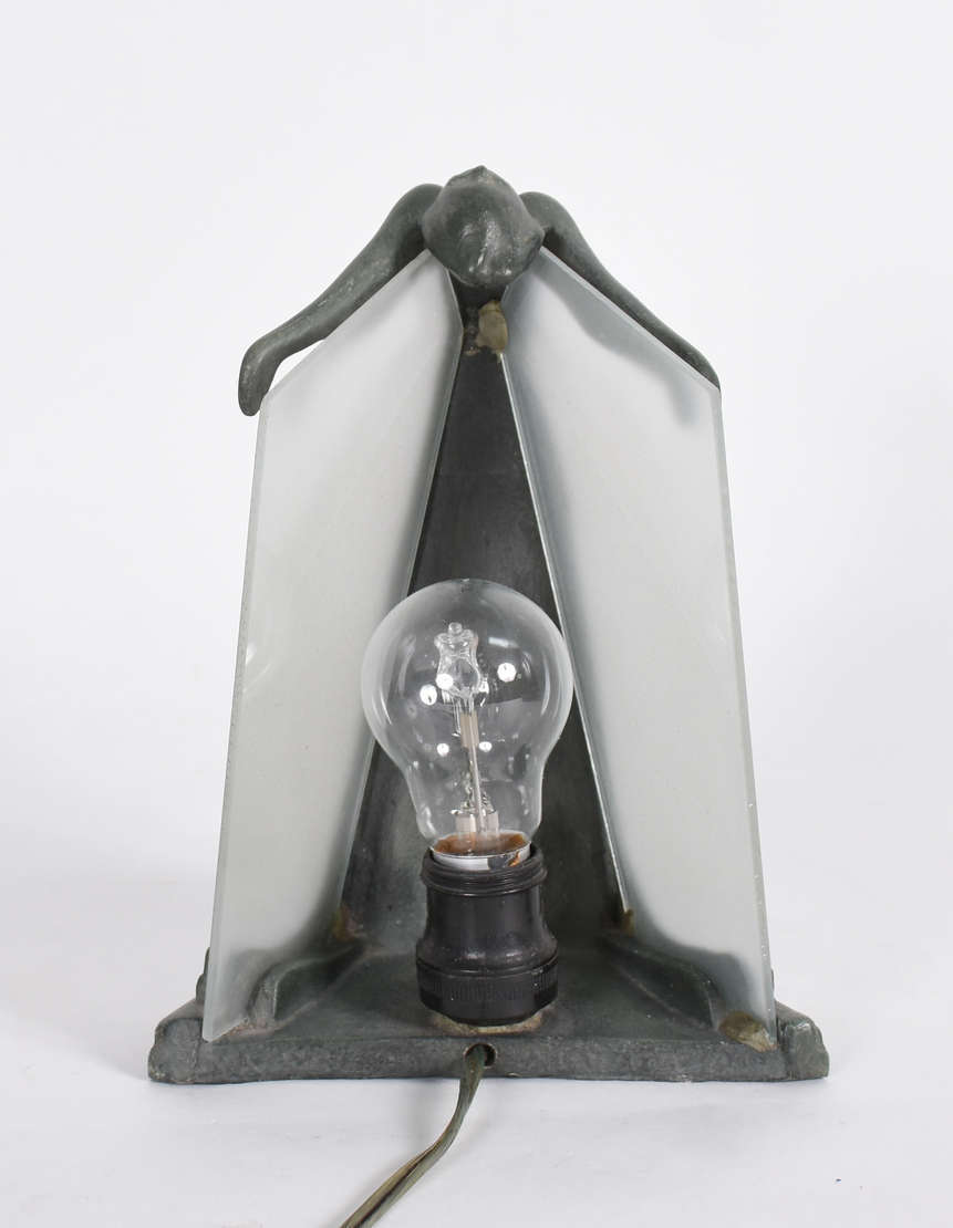 Luminária de mesa, estilo Art- Noveau para 2 luzes, em metal patinado, cúpulas em murano policromado.
