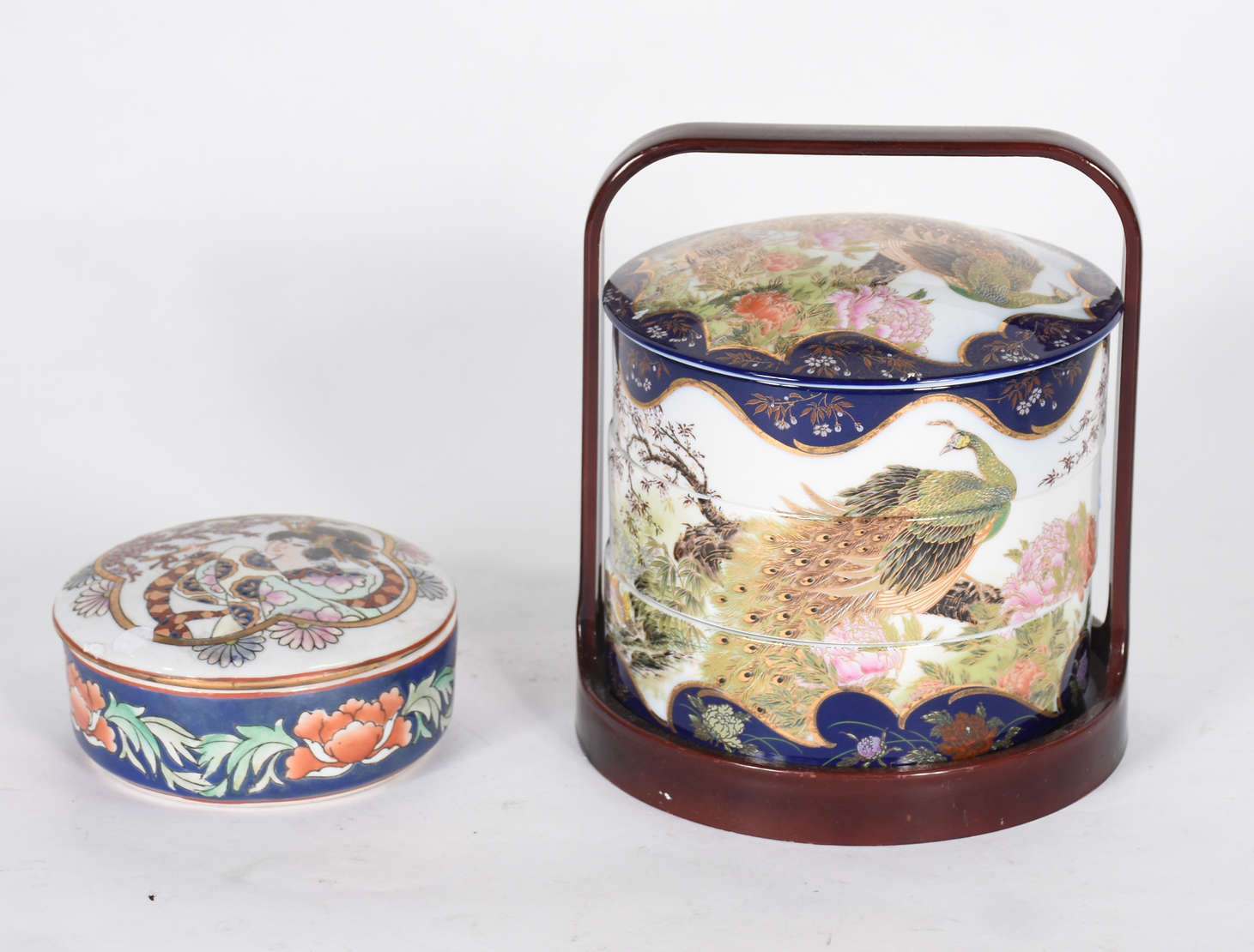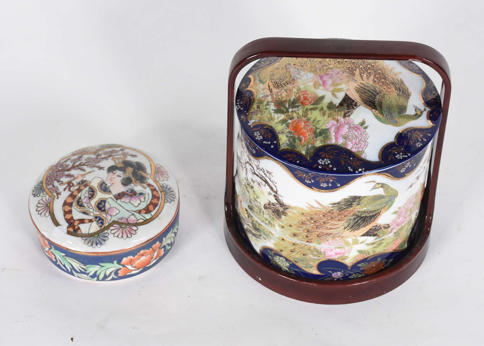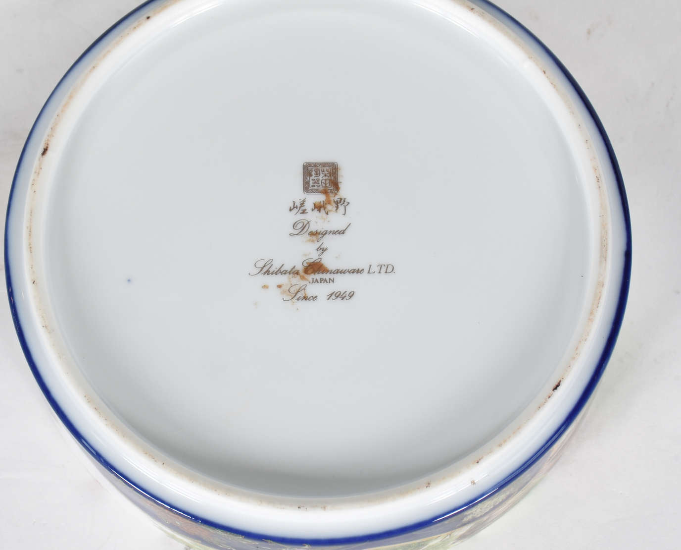 Par de vasos de porcelana chinesa decorados com aves do paraíso em policromia e ideogramas.