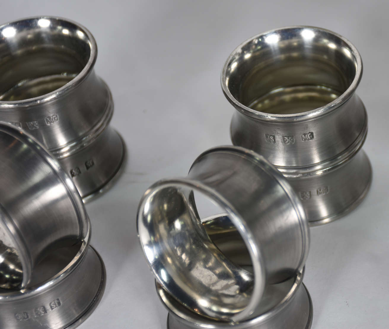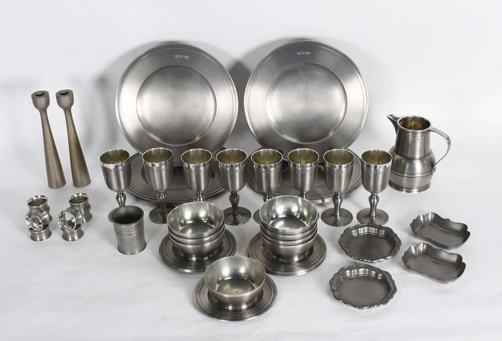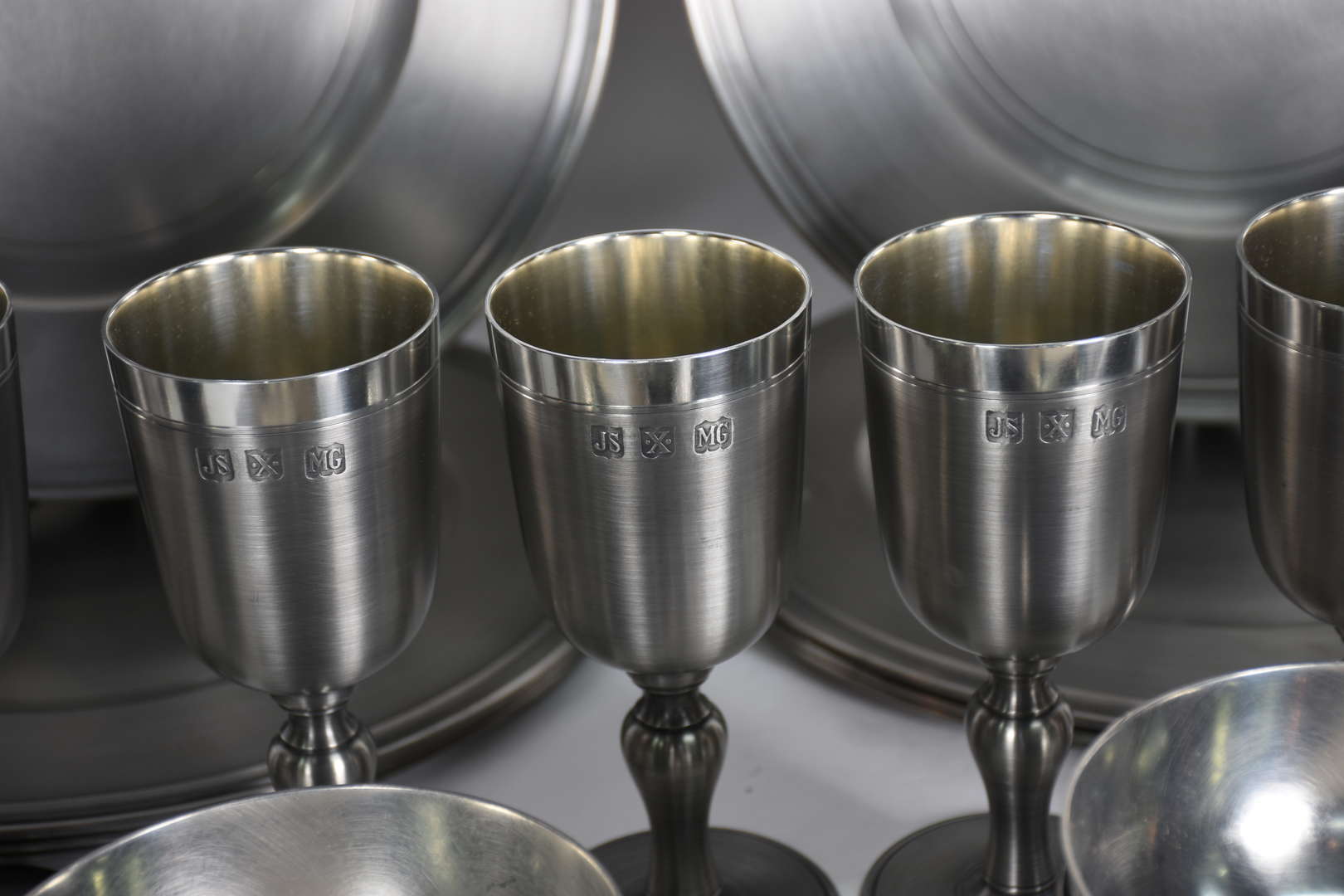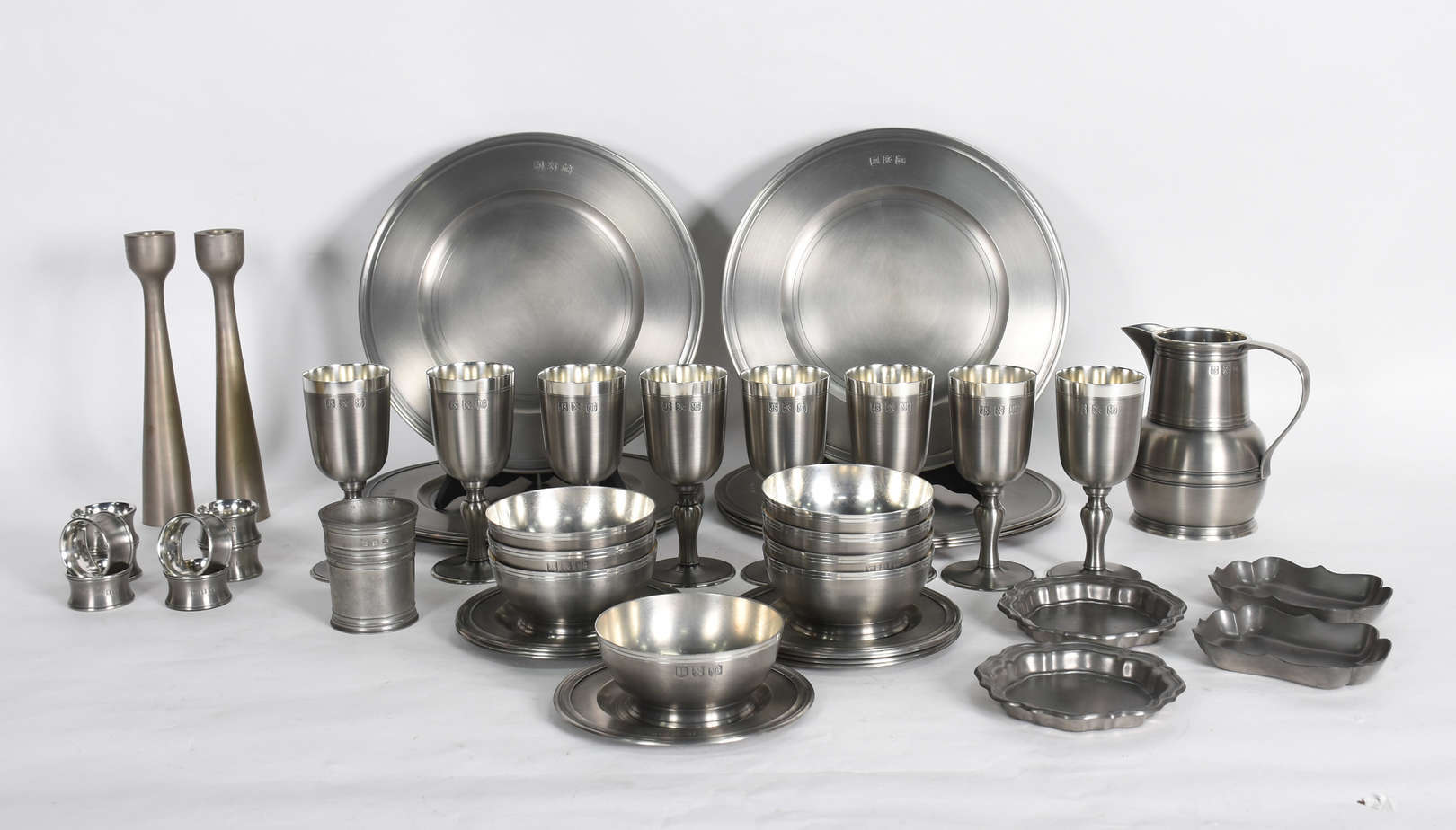 Diversas peças de metal, sendo bandeja com alças e 12 descansos para talheres.