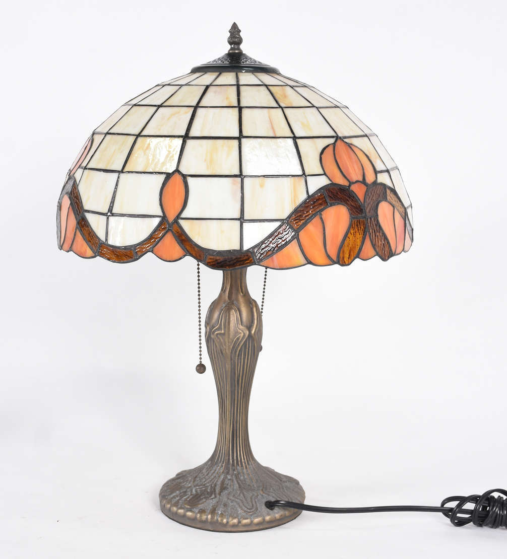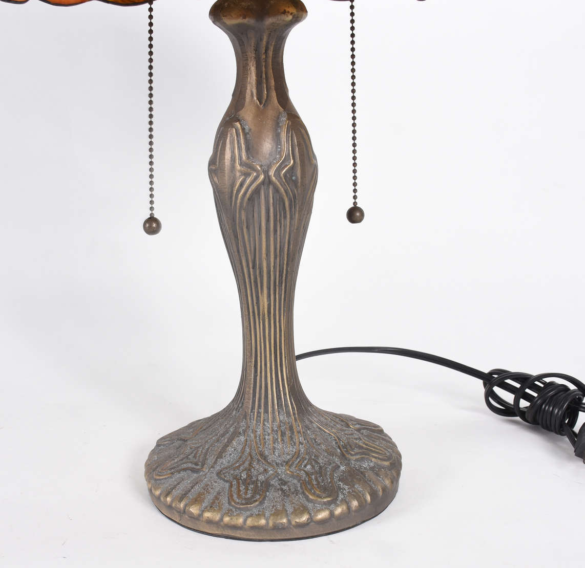 Luminária de mesa, estilo Art- Noveau para 2 luzes, em metal patinado, cúpulas em murano policromado.