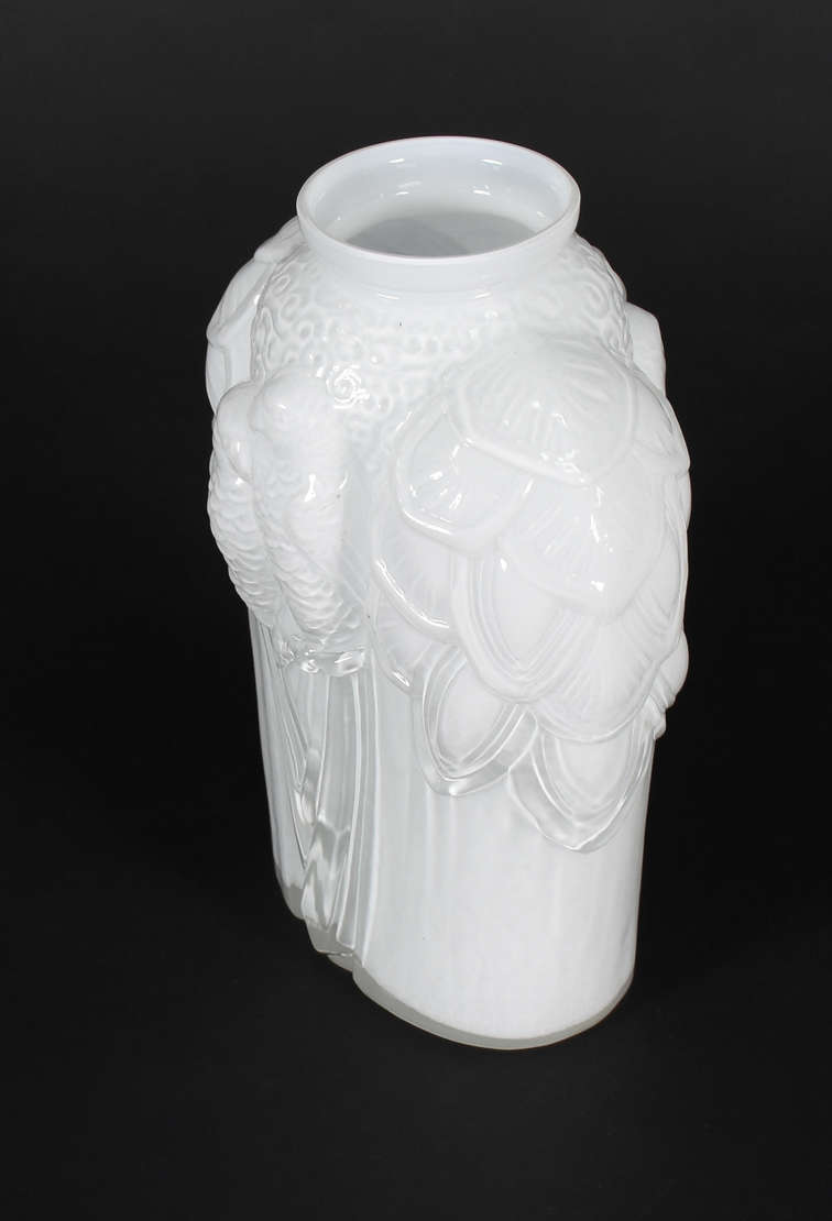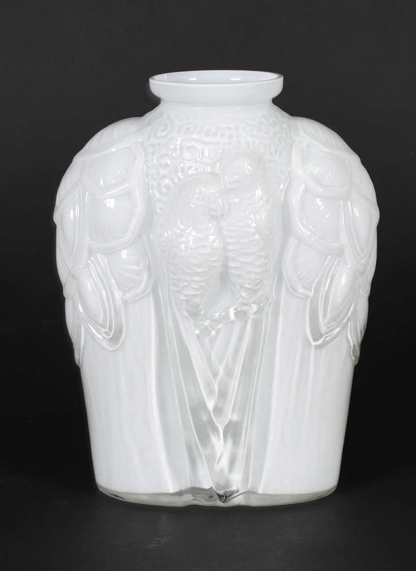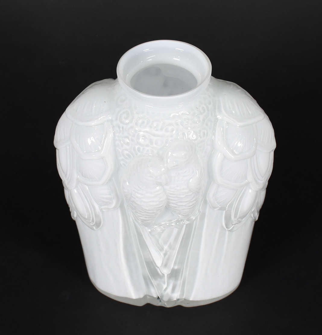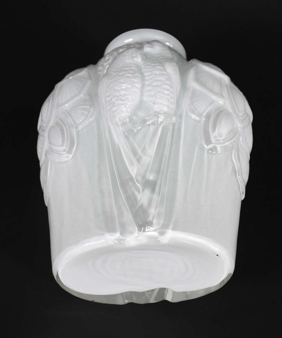 Jarro decorativo de vidro na cor âmbar com pássaros em relevo.
