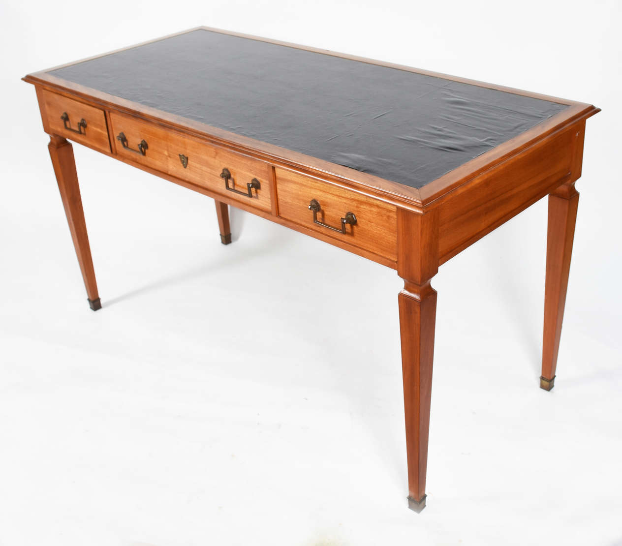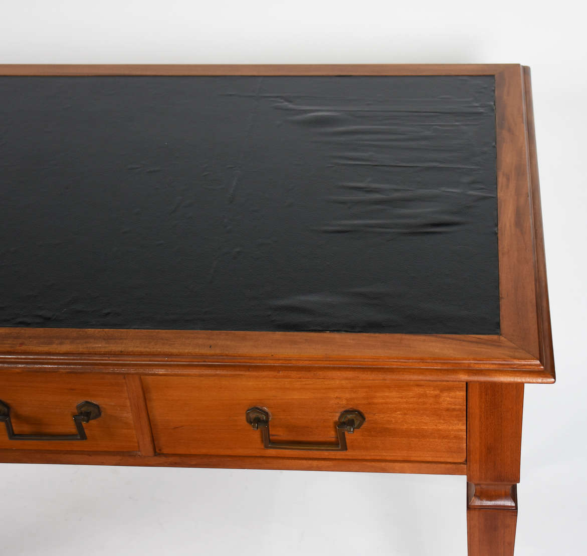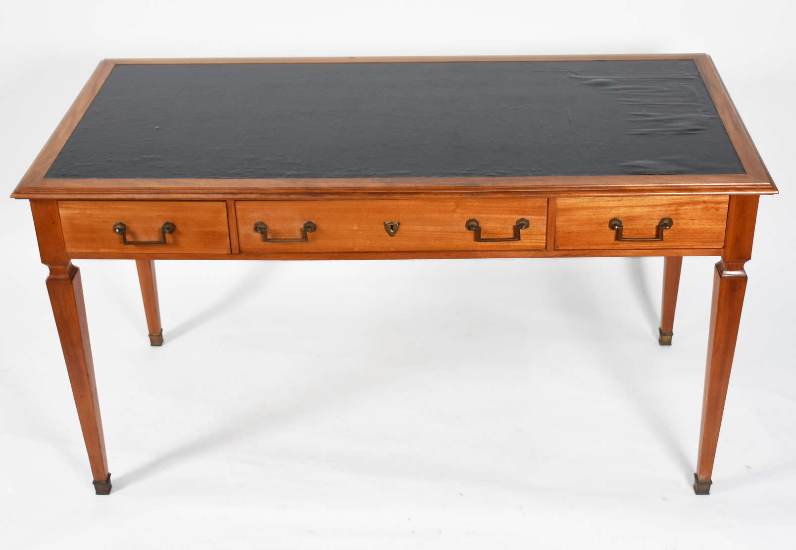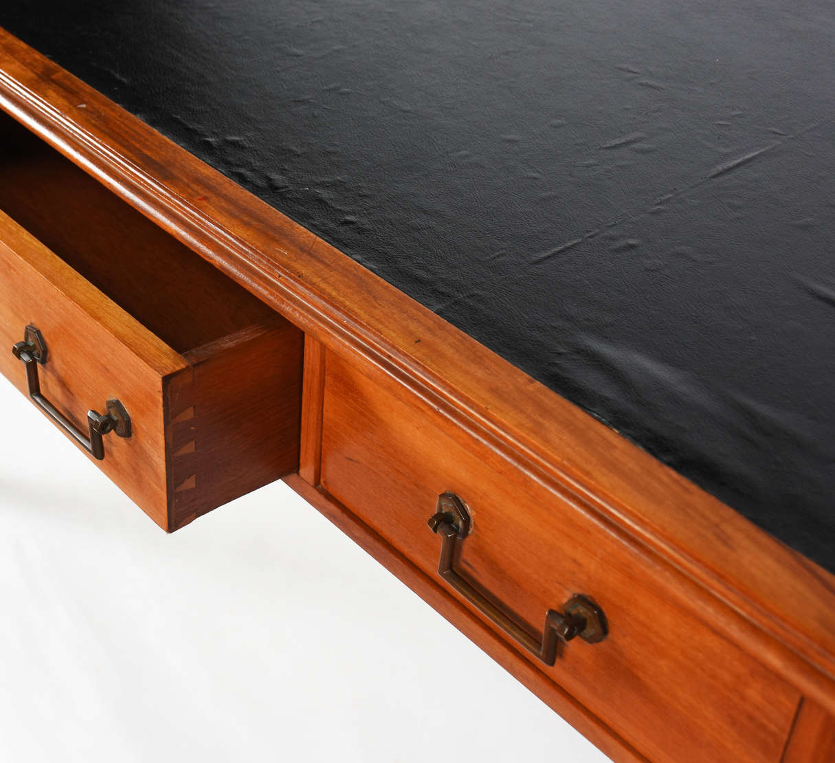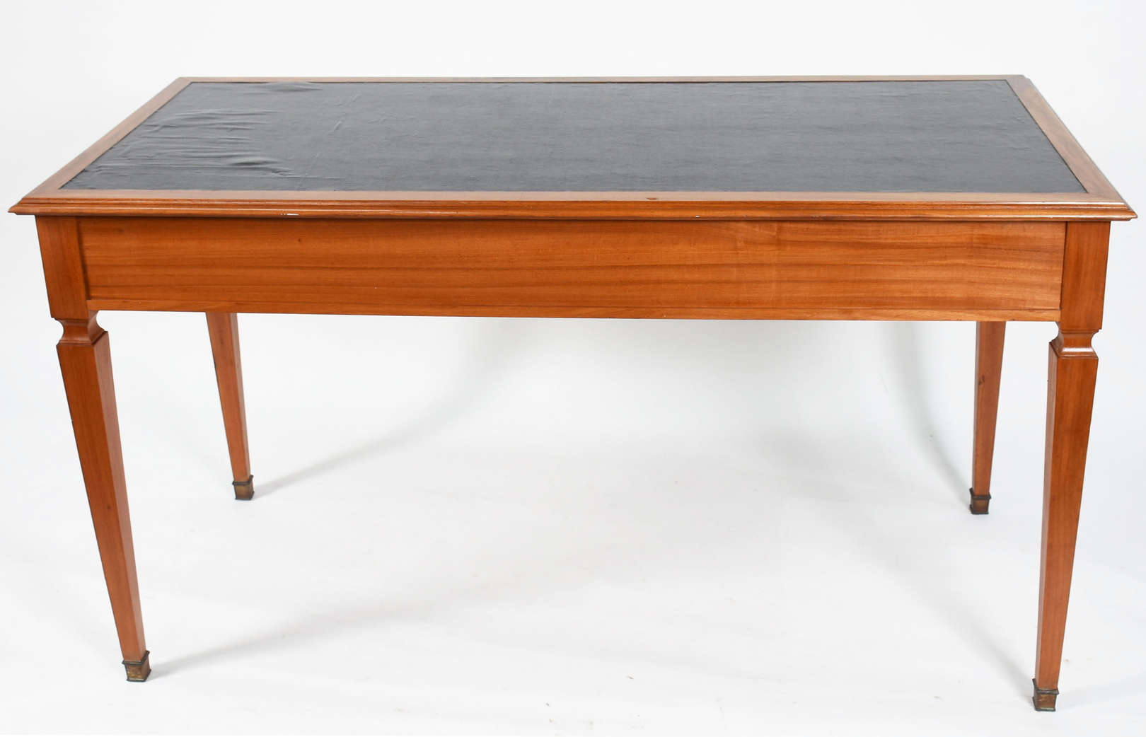 Mesa de madeira nobre, pernas ricamente entalhadas terminando em patas de leão, ligadas por trave inferior.