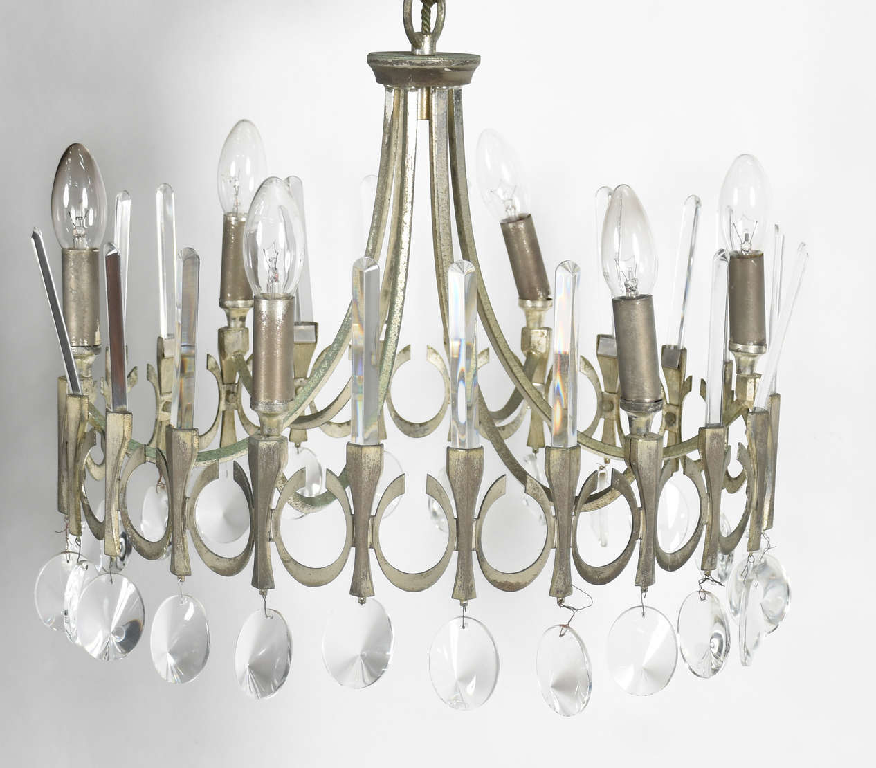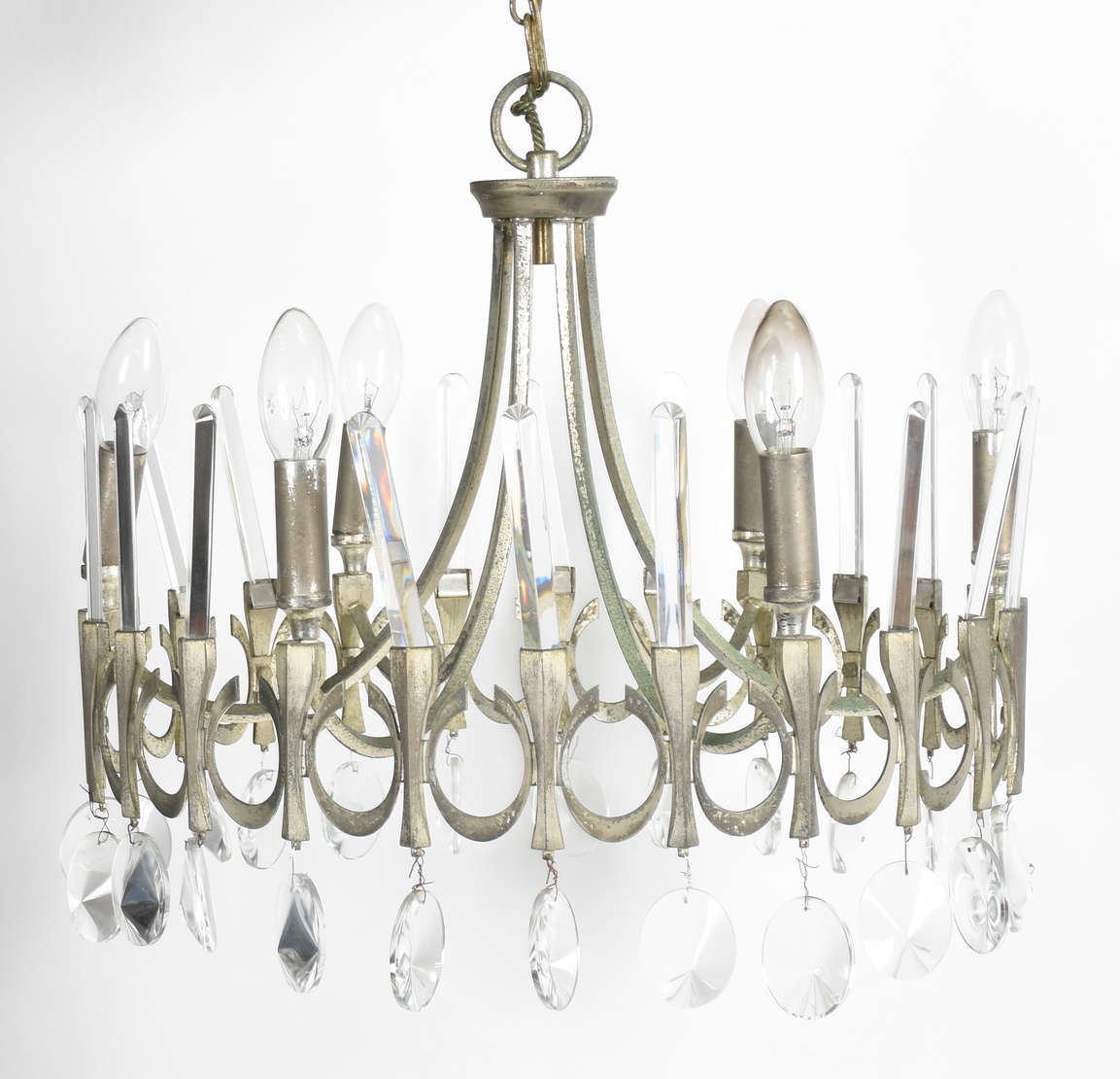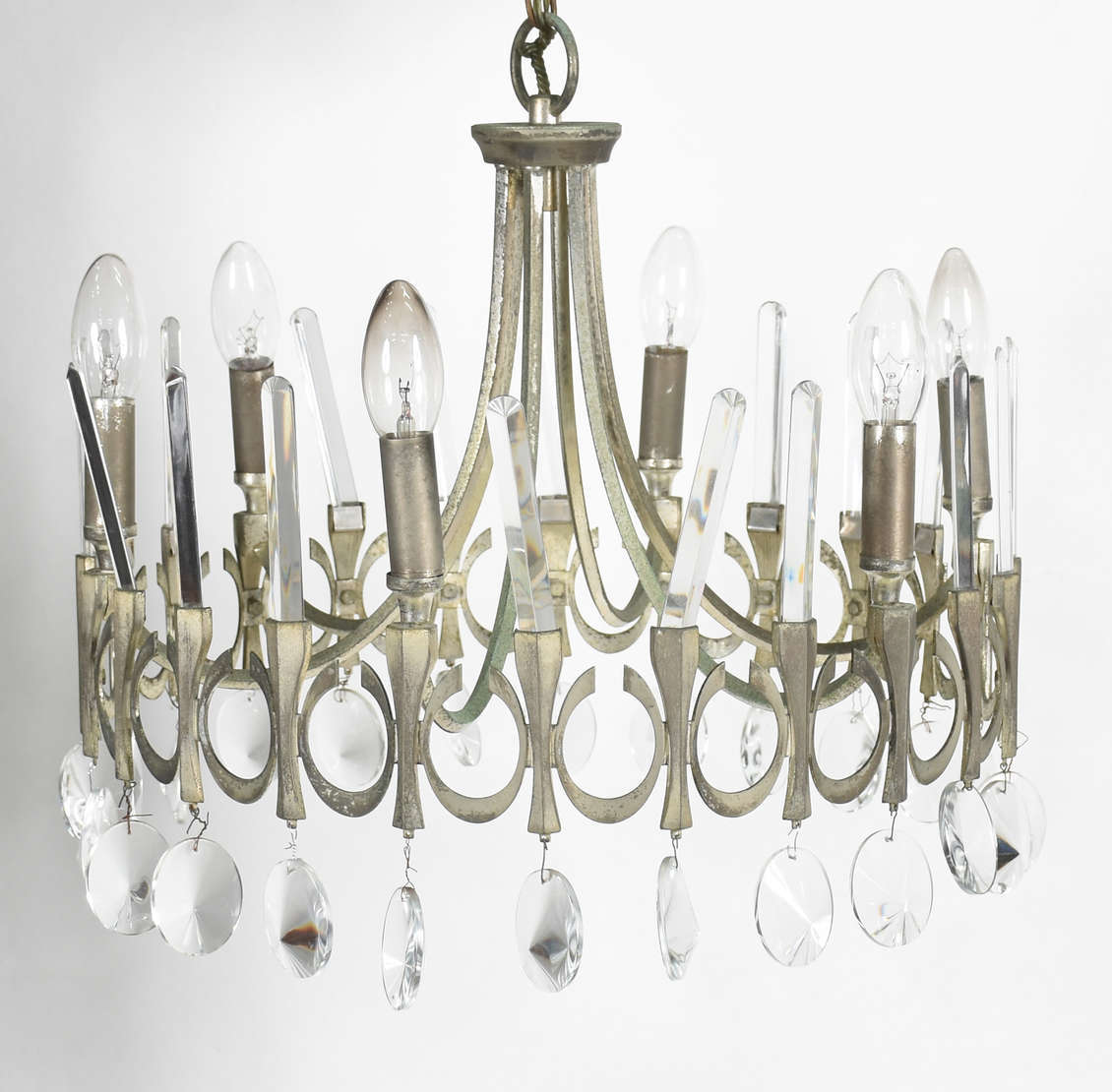 Lustre para 5 luzes com estrutura de metal dourado e placas de cristal lapidado. (metal com oxidações).
