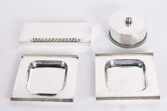 Quatro peças de metal prateado, sendo 2 cinzeiros, 1 caixa retangular e outra redonda.