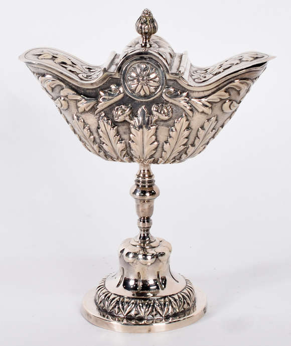 Naveta de prata portuguesa contraste P Coroa, ricamente trabalhada com folhagens em relevo cinzelado. Século XIX.