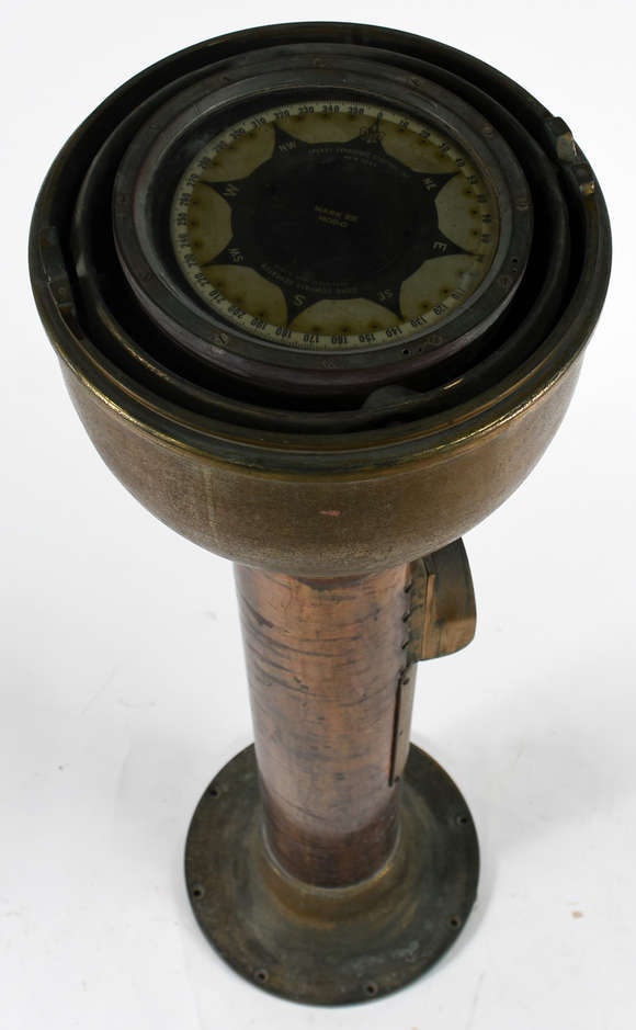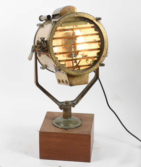 Antiga Lanterna sinalizadora de navio, de bronze com base de madeira, funcionando.