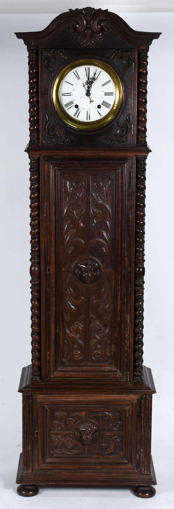 Relógio de coluna com caixa de madeira entalhada, mostrador de metal. (máquina parada, caixa com pequena parte colada...