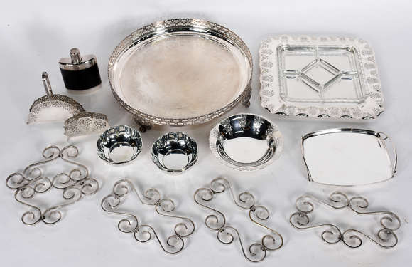 Diversas peças de metal prateado, sendo: grande salva redonda; porta petiscos com base quadrada e recipiente de vidro...