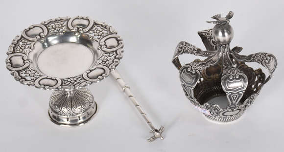 Tres peças sacras de prata, sendo: Coroa, présentoir com pé alto e cetro do divino. (Por questão de segurança a peça...