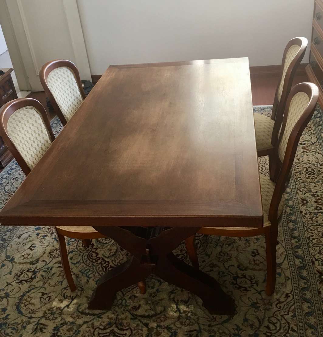 Mesa de jantar de madeira nobre estilo colonial brasileiro, acompanham 4 cadeiras com assentos estofados. Retirada no apt na Rua das Laranjeiras.