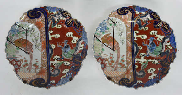 Par de belíssimos medalhões de porcelana japonesa Imari, borda recortada, século XIX.