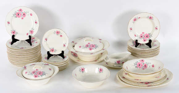 Aparelho de jantar de faiança inglesa, decoração floral em policromia, composto de: 24 pratos rasos (14 com craquelê)...