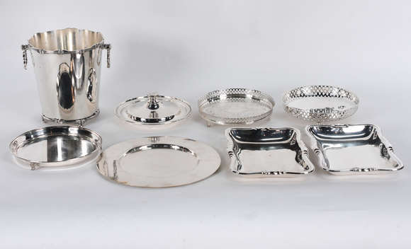 Oito peças diversas de metal prateado, sendo wine cooler (alt.22 diametro 20 cm, uma das alças esta solta), e outras ...