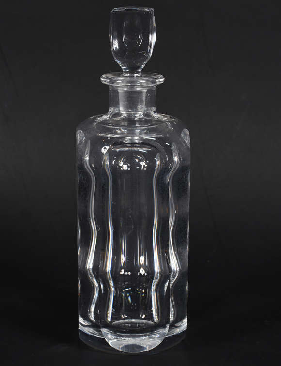 Garrafa de cristal facetado, tampa com parte interna tendo pequenos bicados, assinada e numerada na base.