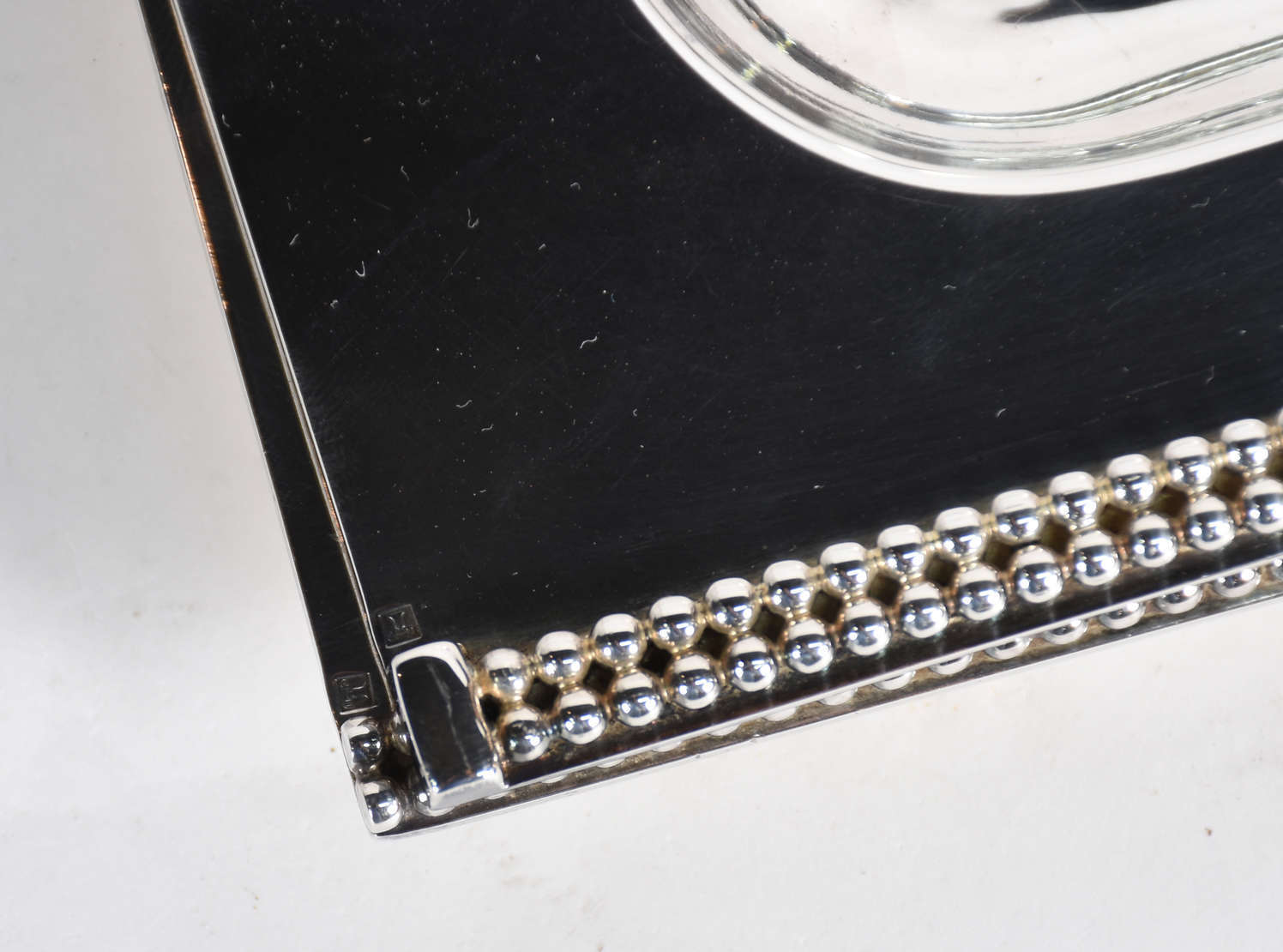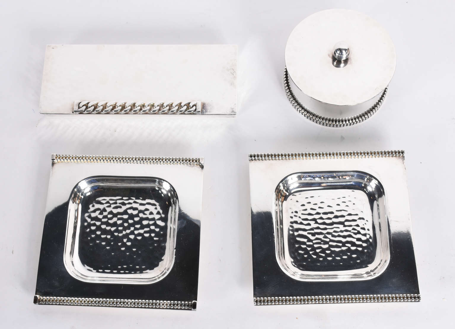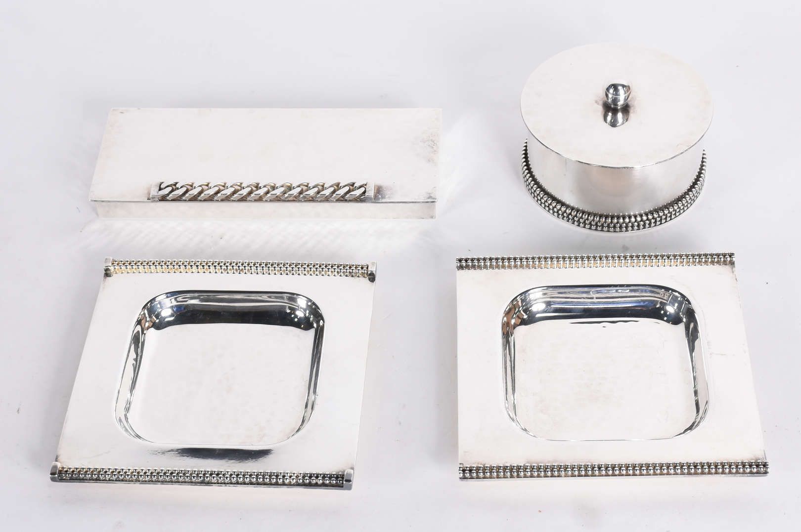 Diversas peças de metal prateado, sendo: grande salva redonda; porta petiscos com base quadrada e recipiente de vidro...