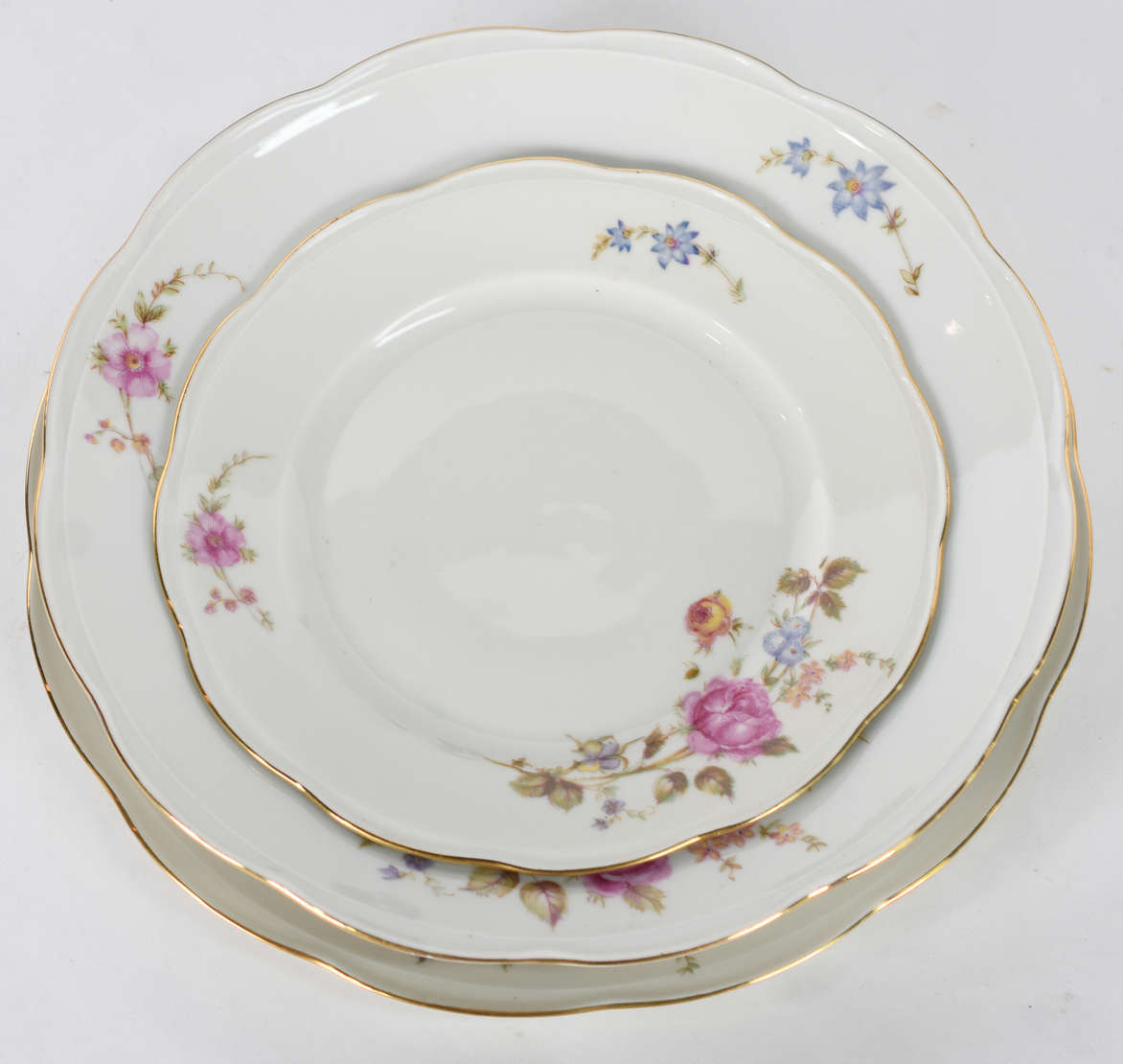 Aparelho de jantar de faiança inglesa, decoração floral em policromia, composto de: 24 pratos rasos (14 com craquelê)...